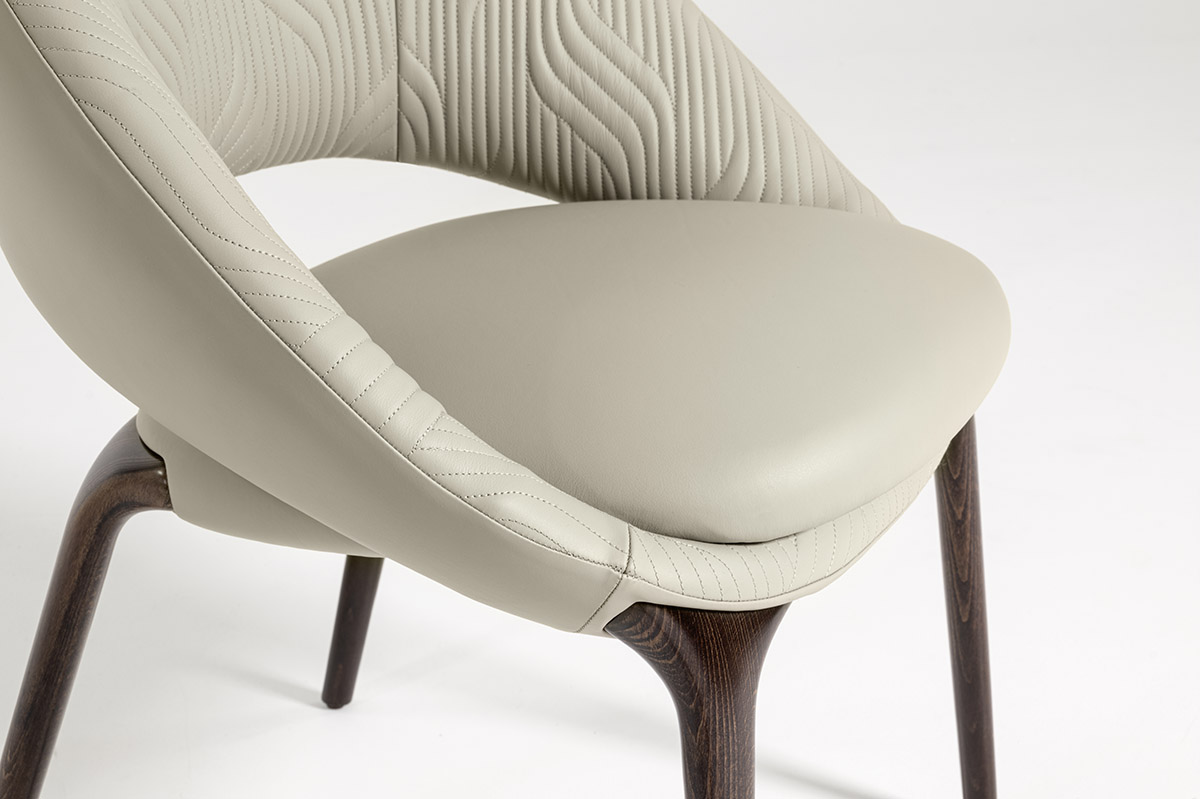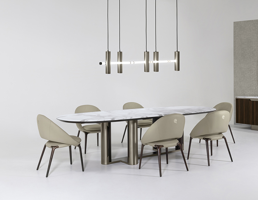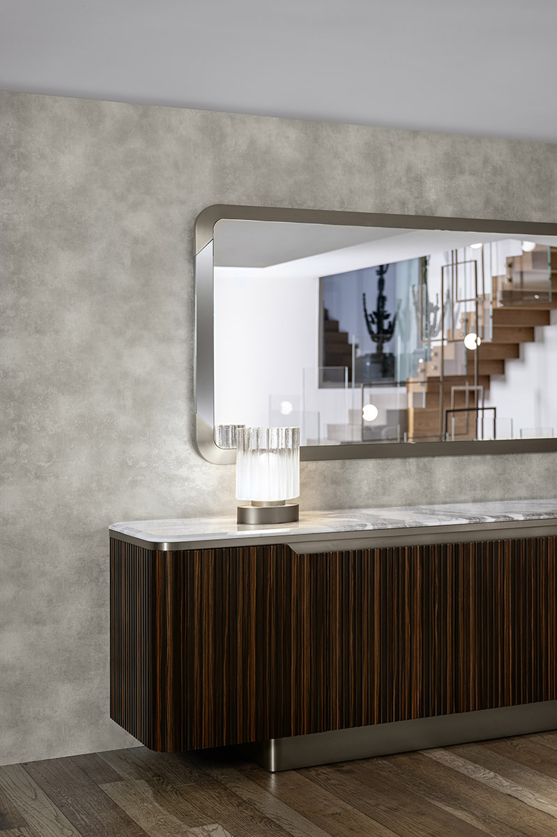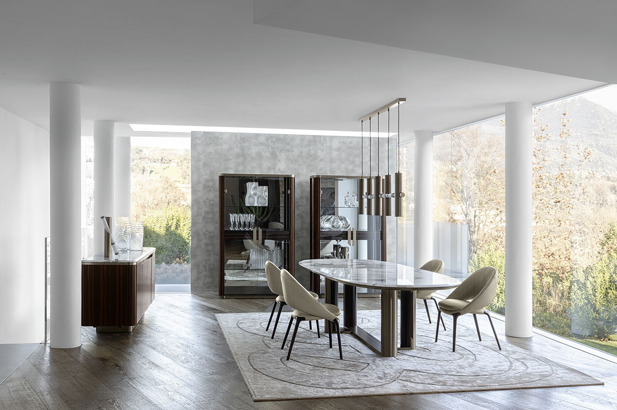 Boat shape oval table with beveled top in high gloss finish Namibian Oyster marble. 4 legs and base in combination of satined Makassar Ebony veneer and satined galvanized titanium finish stainless steel. Fully upholstered chair in solid beech available in first grade leather. Quilted inside back and outside back with embroidered Giorgio Collection logo. Seat height cm.47. Buffet with 4 doors in ribbed satined Makassar Ebony veneer. Beveled top in high gloss finish Namibian Oyster marble. Base and details in satined galvanized titanium finish stainless steel. 1 interior full extension drawer with front in satined Makassar Ebony veneer, bottom part in velvet fabric. 3 adjustable tempered glass shelves. Mirror: Rectangular mirror with frame in combination of glass and satined galvanized titanium finish stainless steel.