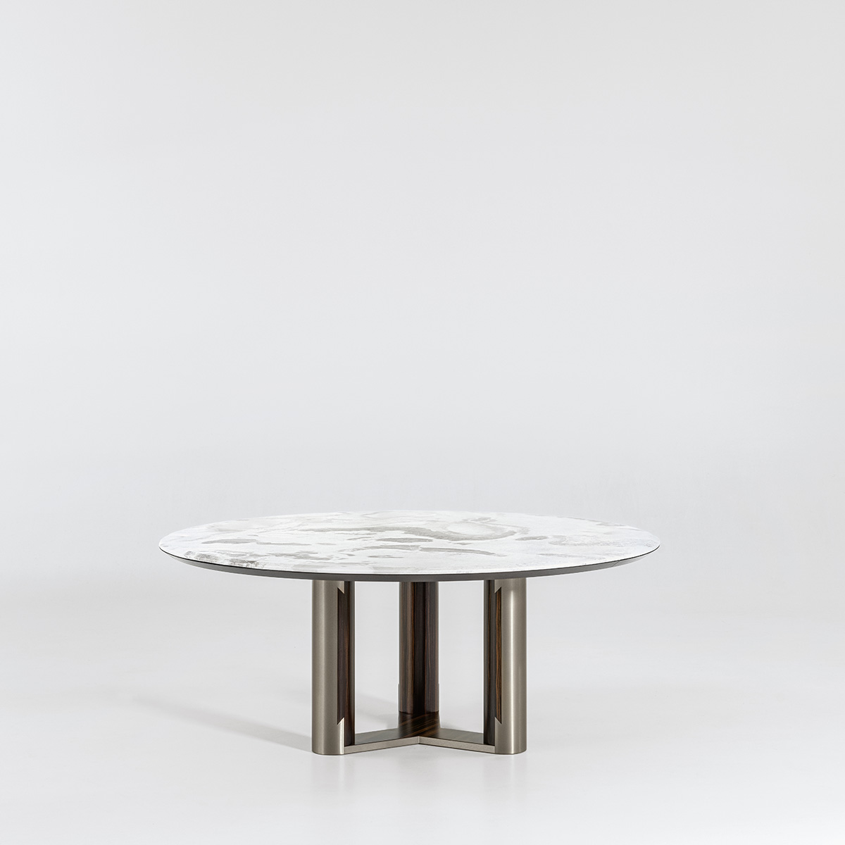 Round table with beveled top in high gloss finish Namibian Oyster marble. 3 legs and base in combination of satined Makassar Ebony veneer and satined galvanized titanium finish stainless steel.