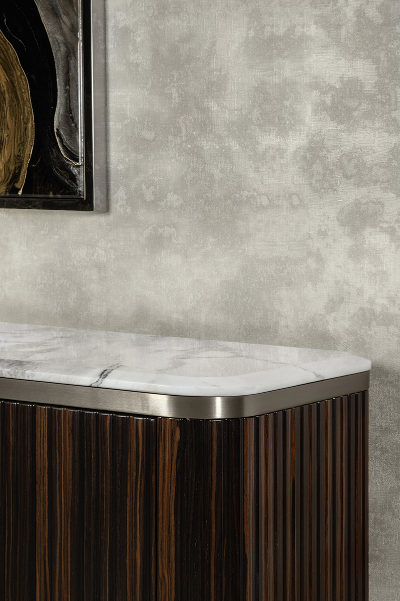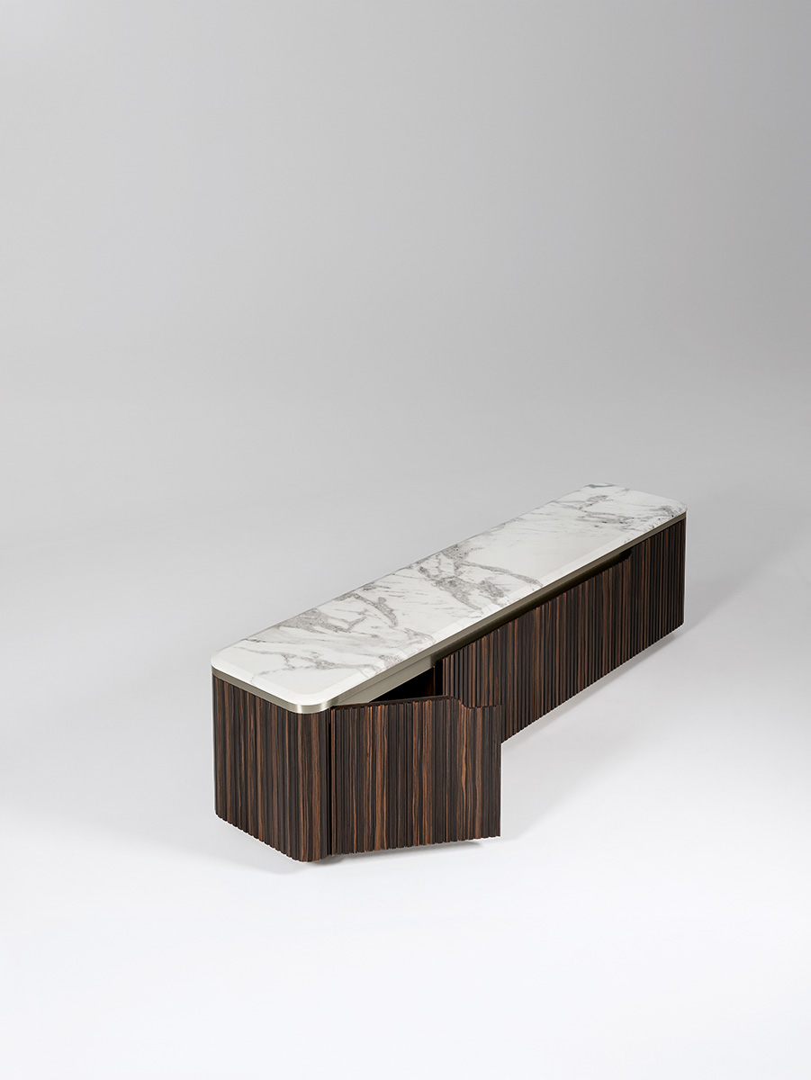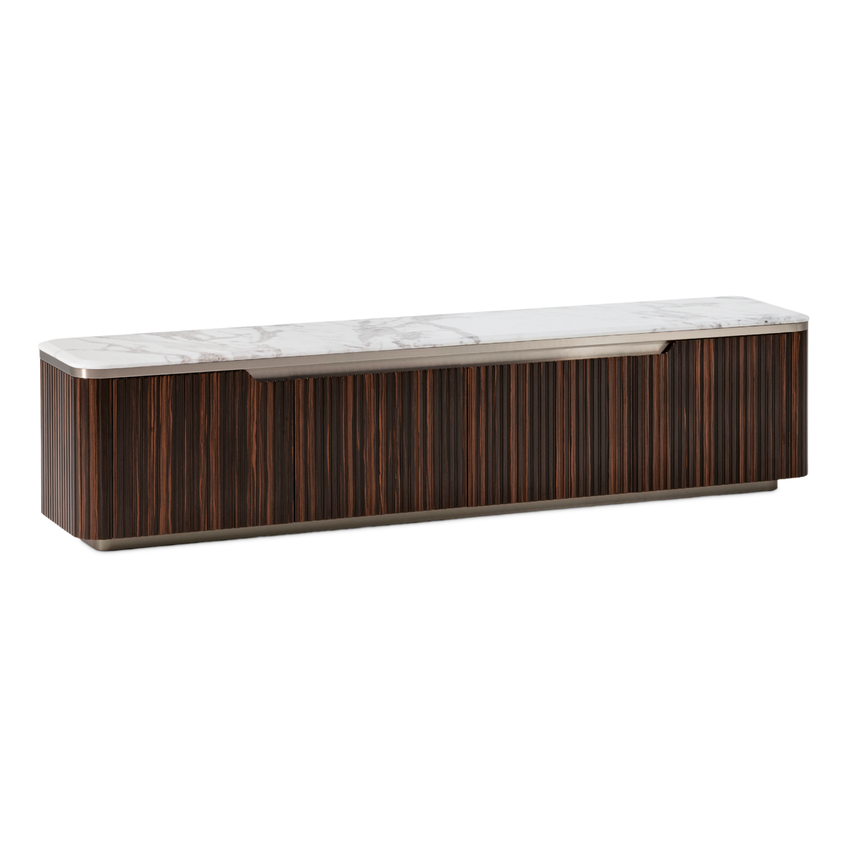 Base for TV unit in ribbed satined Makassar Ebony veneer. Beveled top in high gloss finish Namibian Oyster marble. Base and details in satined galvanized titanium finish stainless steel. 4 wooden doors with 3 inside adjustable tempered glass shelves.