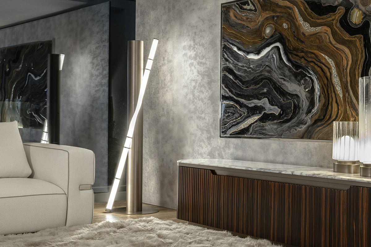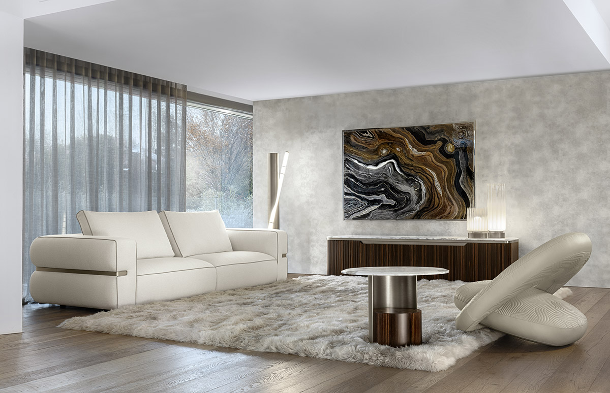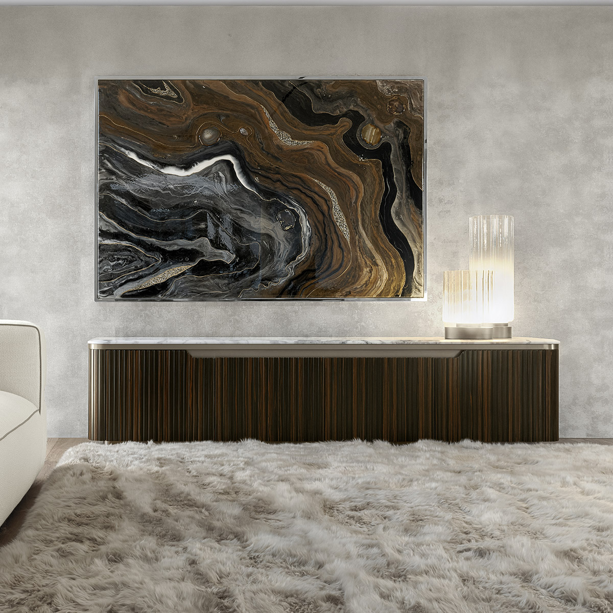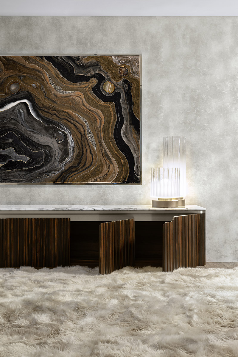 Base for TV unit in ribbed satined Makassar Ebony veneer. Beveled top in high gloss finish Namibian Oyster marble. Base and details in satined galvanized titanium finish stainless steel. 4 wooden doors with 3 inside adjustable tempered glass shelves.