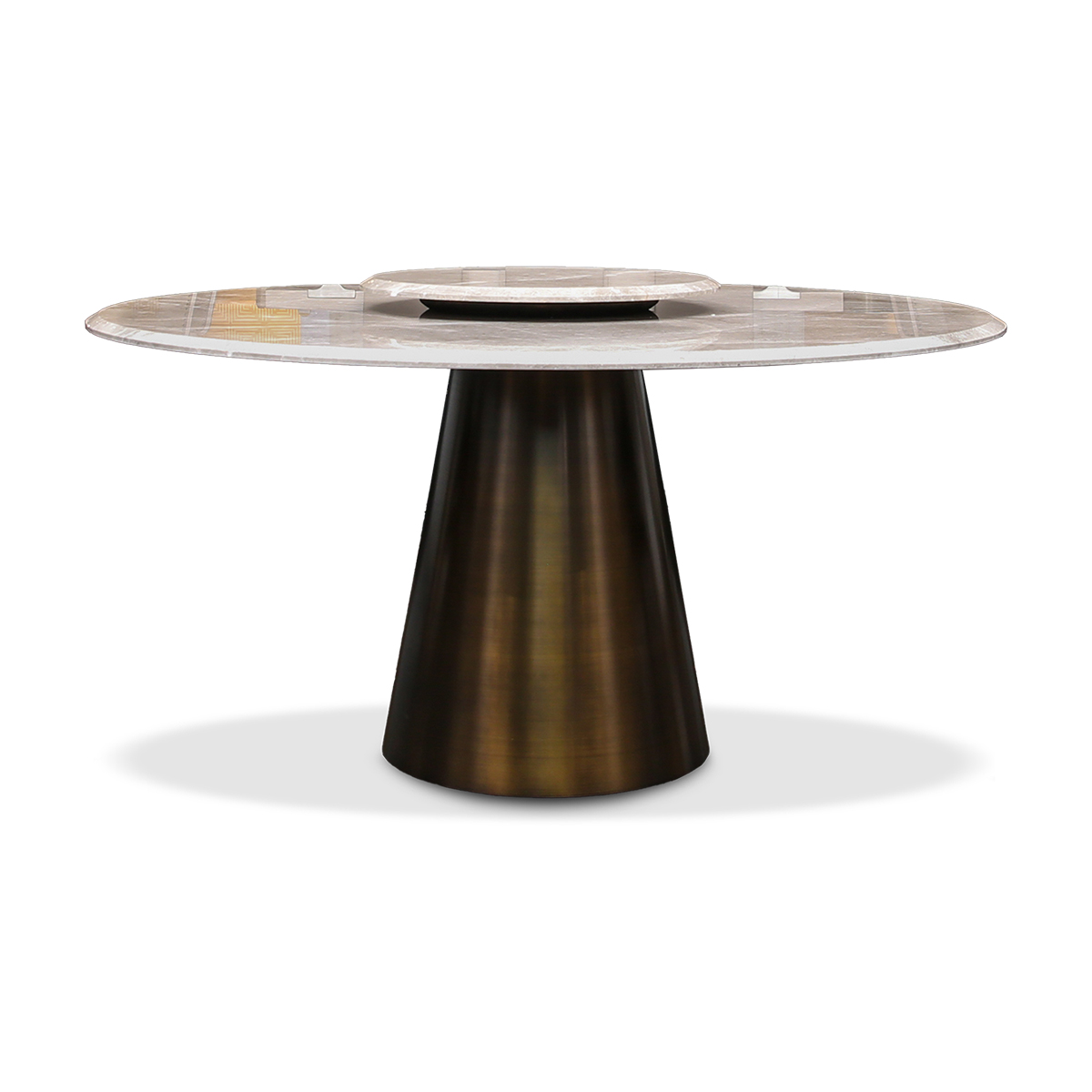 Malibu Round Dining Table is a contemporary statement piece that blends sculptural simplicity with refined elegance. It features a beautifully handcrafted round marble top in Apuan Storm with a delicately beveled polished edge, highlighting the natural beauty of the stone. The striking conical metal base in an oxybronze finish adds a warm, modern character while ensuring sturdy support. Complete with a rotating lazy susan for added functionality, this dining table offers both visual sophistication and practical convenience, making it an ideal centerpiece for modern dining interiors.