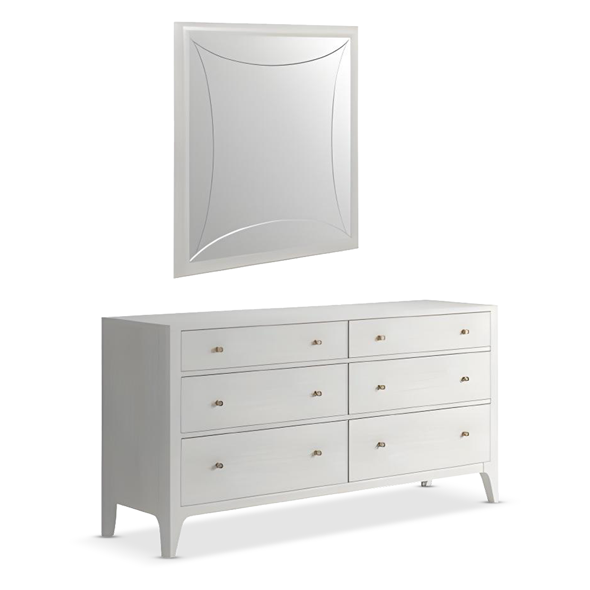 Mezzanine drawer and mirror by A.R.T. Furniture embodies classic beauty with a modern twist, reflecting the refined character of the collection. Crafted from maple veneer in an elegant dove gray finish, the dresser features six drawers with soft-close glides, while the lower drawers are lined in aromatic cedar for an added touch of luxury. Nickel-finished round pulls enhance its timeless appeal. Complementing the dresser, the mirror showcases a sleek silver frame accented with graceful etched curves, blending vintage Parisian romance with streamlined contemporary style. Together, this set creates a sophisticated focal point that elevates transitional interiors with warmth and elegance.