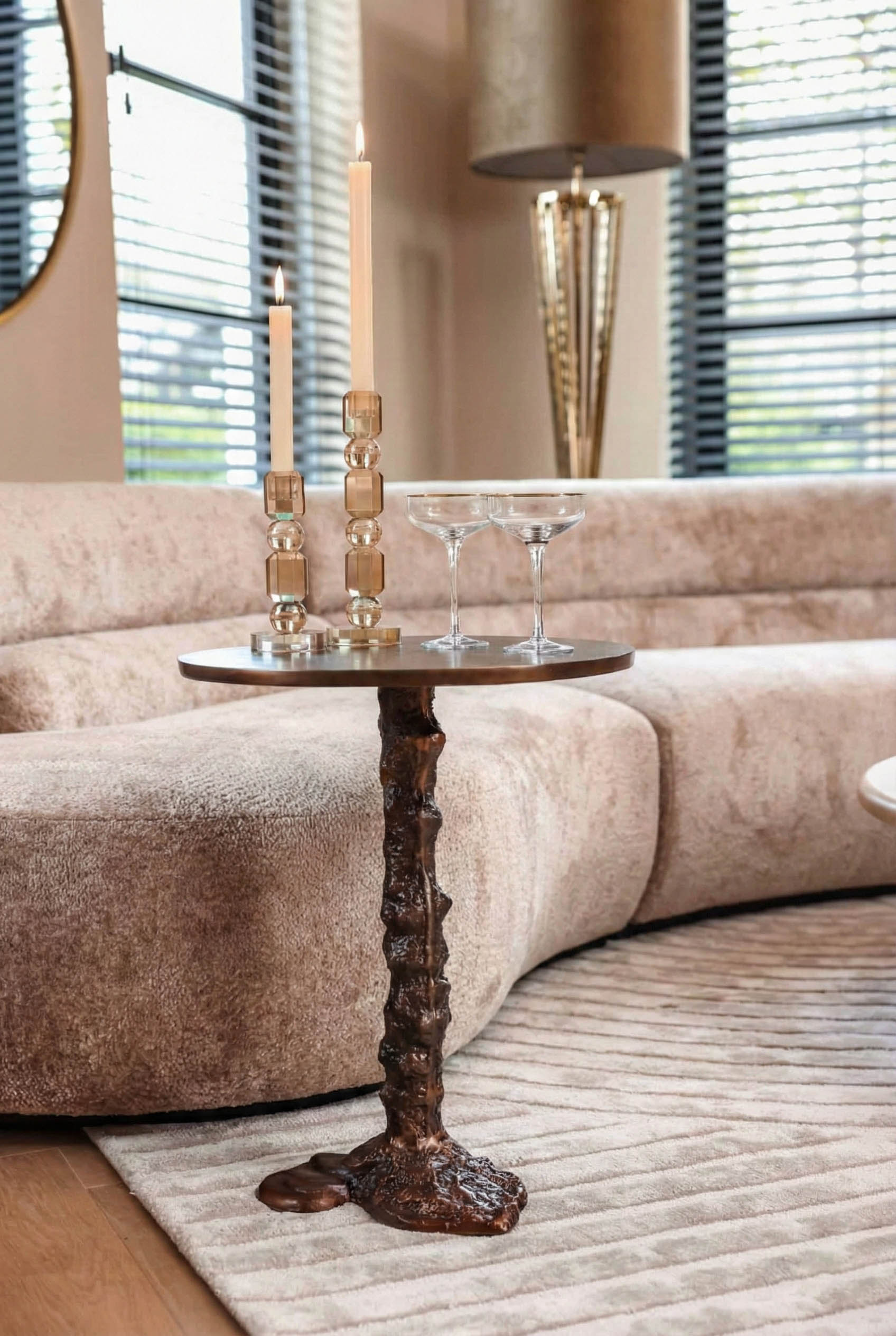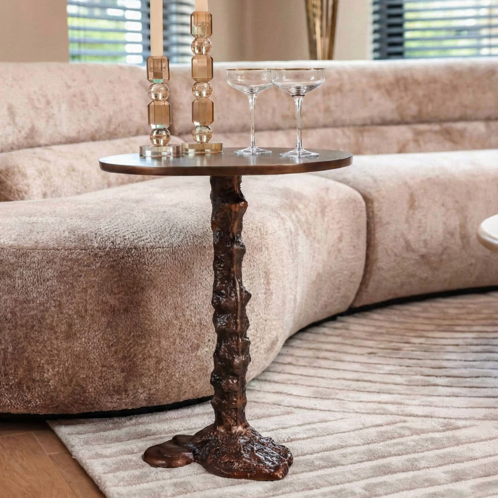 The Misty , available in a set of 2, are beautiful pieces of furniture made of bronze-colored aluminum. These side tables exude a warm and elegant atmosphere, with the bronze-colored aluminum providing a luxurious and refined look. The timeless design of the Misty makes them versatile and decorative elements, perfect for use in the living room, bedroom, or hallway.