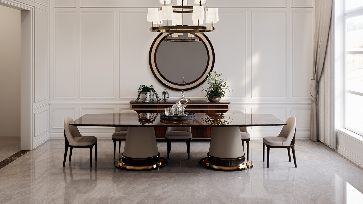 With a seating capacity of 12, this luxury dining set is perfect for hosting extravagant dinner parties or intimate gatherings. Measuring at a width of 350 cm and a height of 76 cm, the dining table is both spacious and functional. The sidechair's width of 60 cm and height of 80 cm provide ample space for your guests to sit comfortably. The sideboard's width of 220 cm and height of 93 cm, along with the mirror's width of 135 cm and height of 135 cm, complete the set with a touch of practicality.