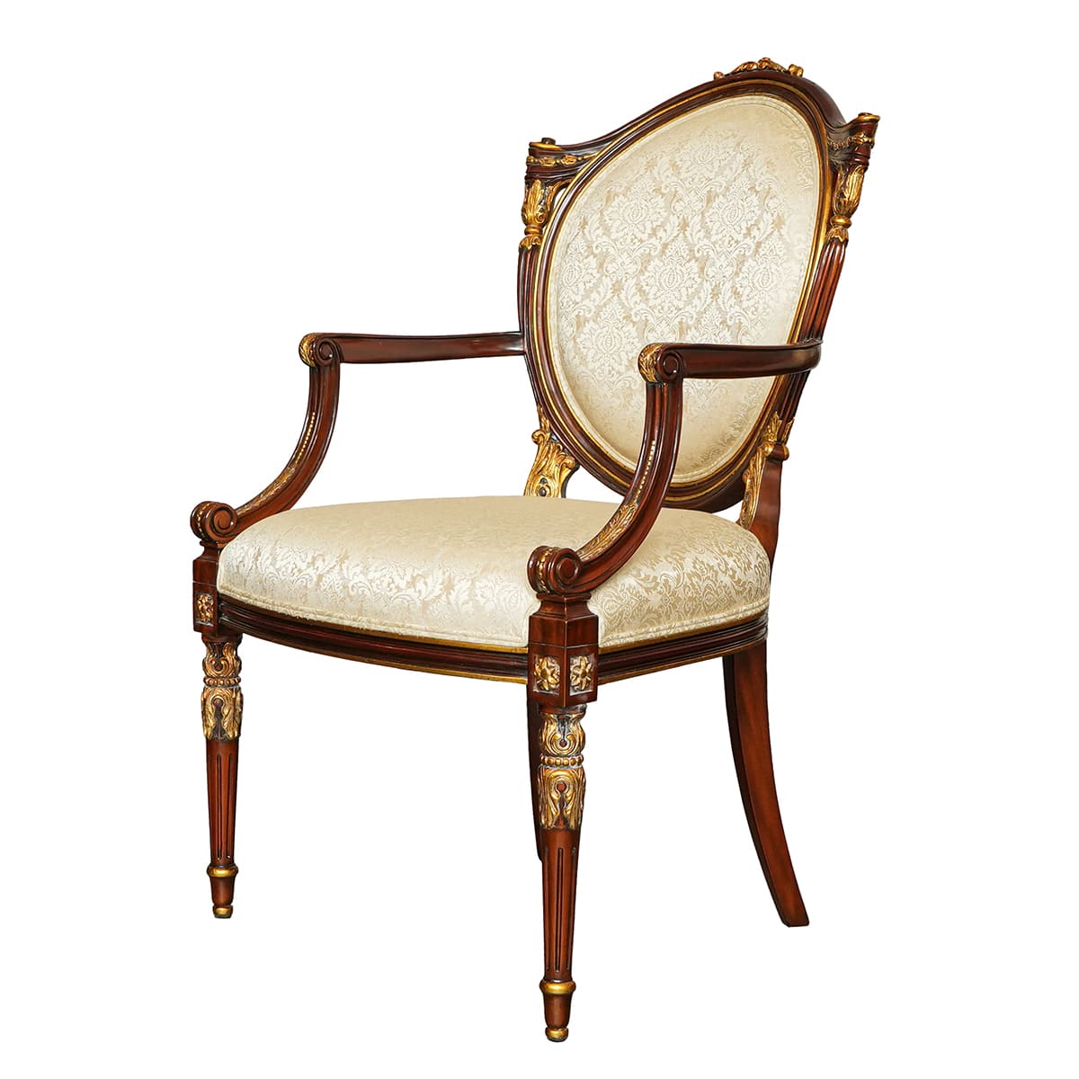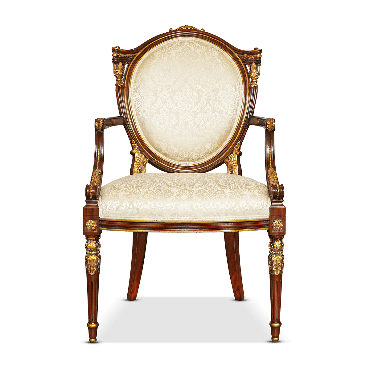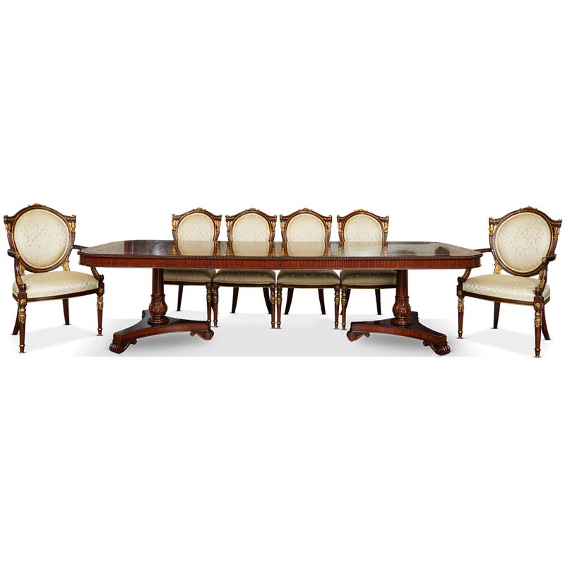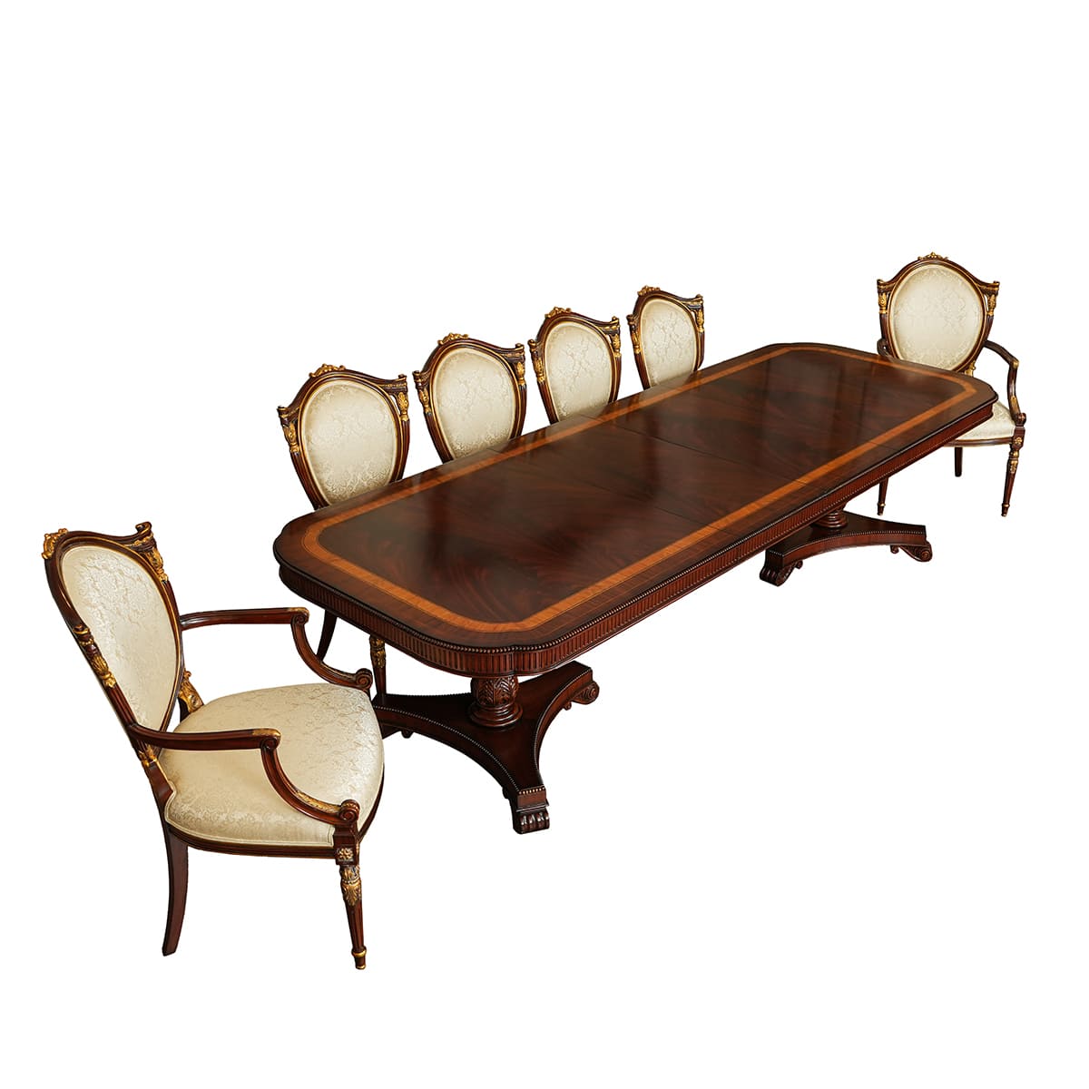 Two Pedestal extension dining table with stunning details such as gold gilded hand carved acanthus leaves on the on the base, curled feet and cross banded satin wood and crotch mahogany veneers. Detailed skirt two pedestals of 106 cm each and two extension leaves of 50 cm each. Extended it is 312 cm and non extended it is 212 cm long. Fits for 8-10 people.The Julius French Side Chair captures the essence of classic French design with the enduring beauty of solid mahogany. Its refined silhouette, sculpted legs, and graceful proportions make it a timeless addition to dining rooms or elegant seating areas. Whether used individually or as part of a set, the Julius Chair adds a distinguished touch to any interior