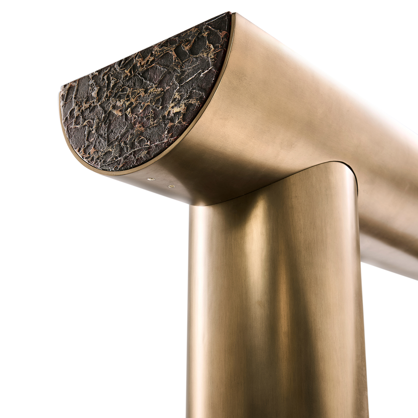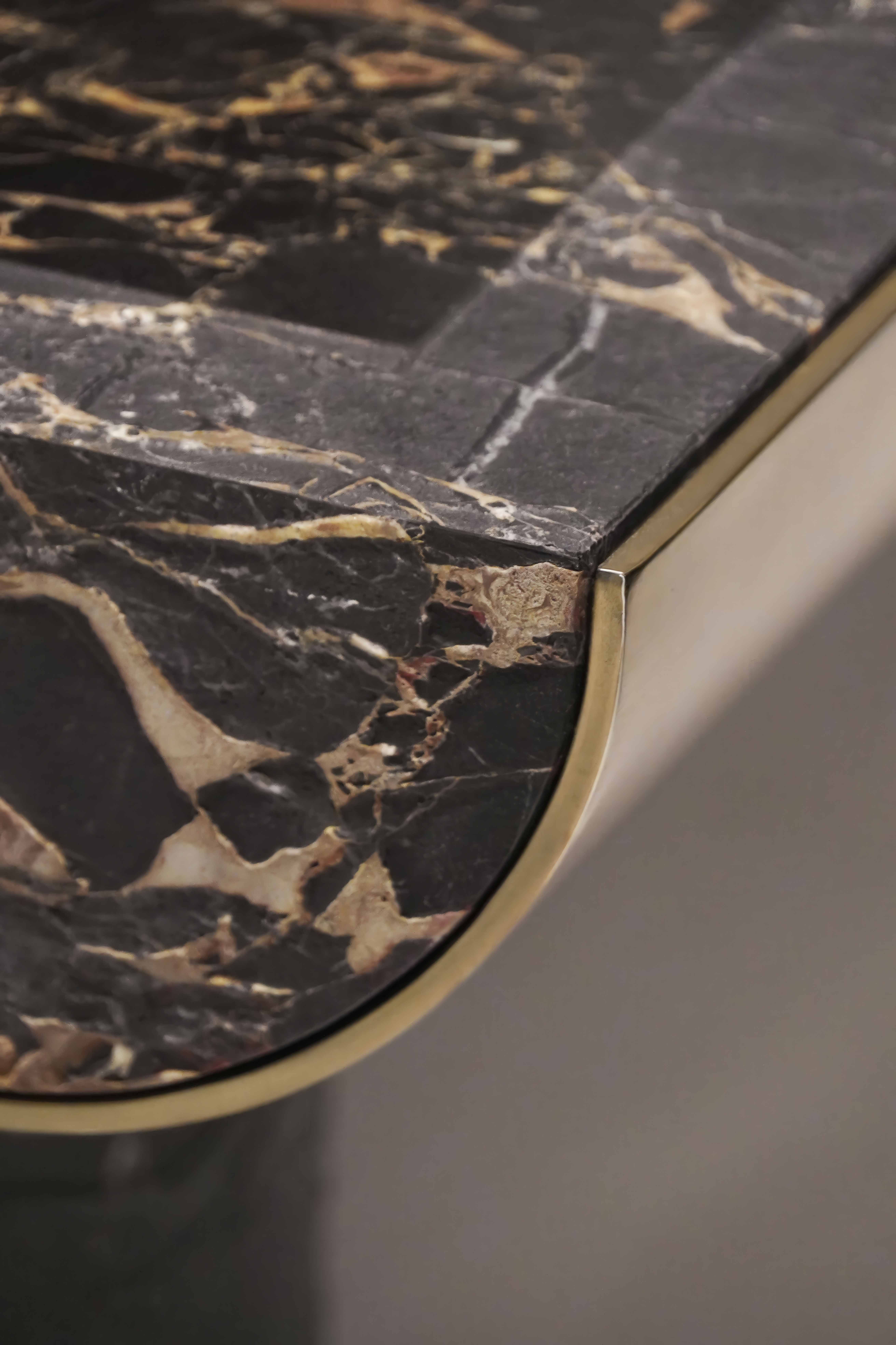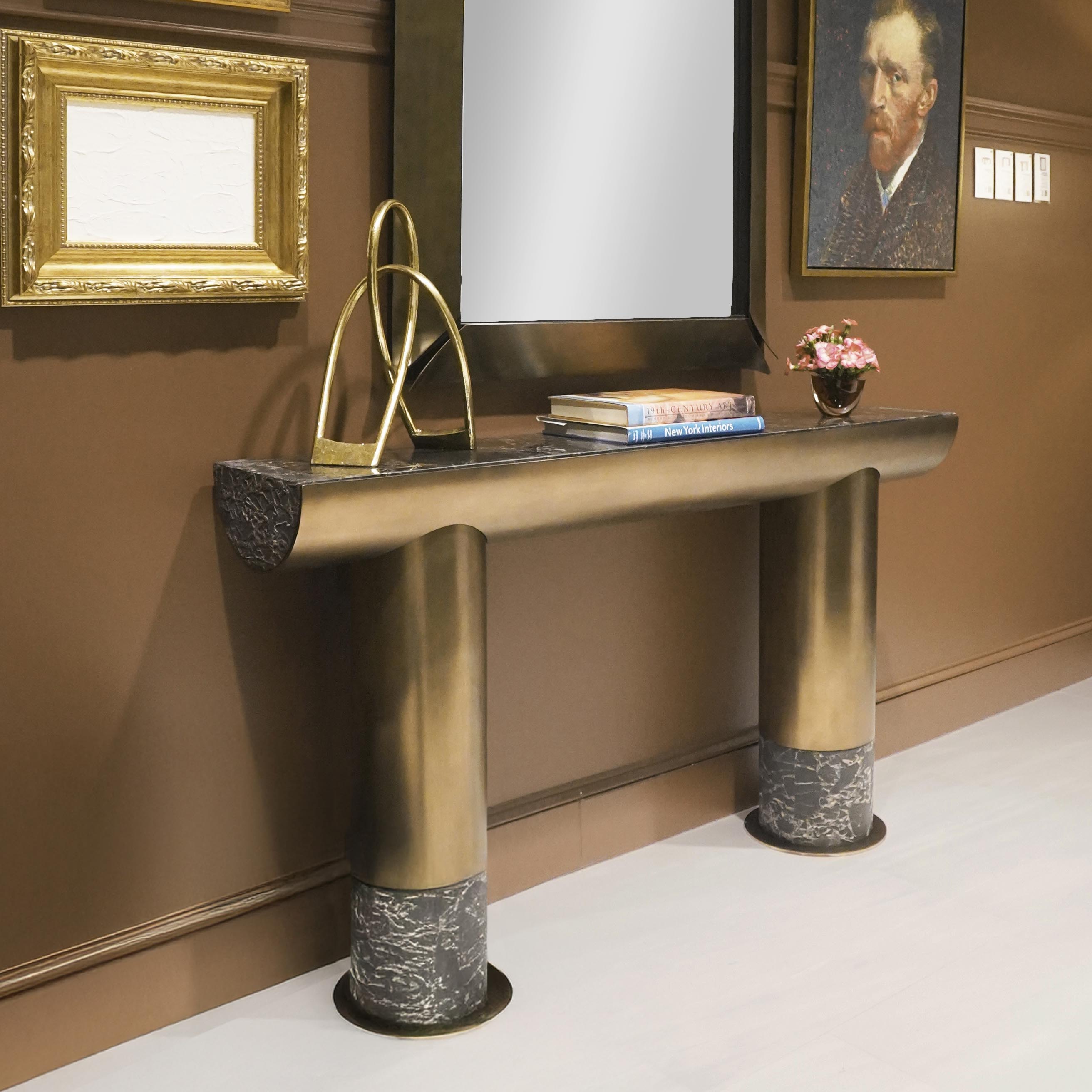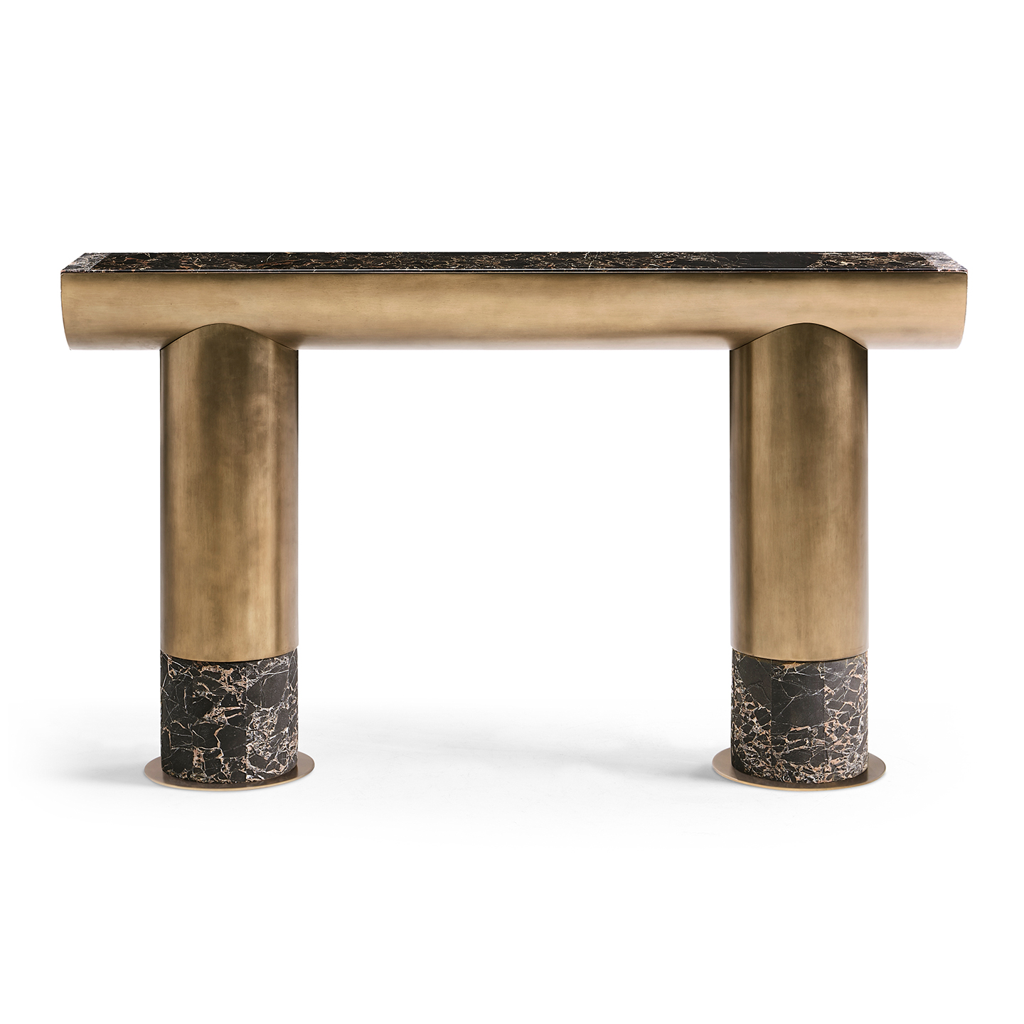 The Nova Console Table is a bold study in contrast and composition, where sleek curvature meets raw material beauty. Featuring a sculptural frame clad in bent brass, this striking console is grounded by solid Weathered Black Marble legs, which echo the drama of the marble top. The fluid lines of the brass juxtapose perfectly with the dense, organic veining of the stone, creating a dramatic tension that feels both modern and timeless. Designed to captivate from every angle, the Nova Console Table is a true testament to refined, architectural luxury.