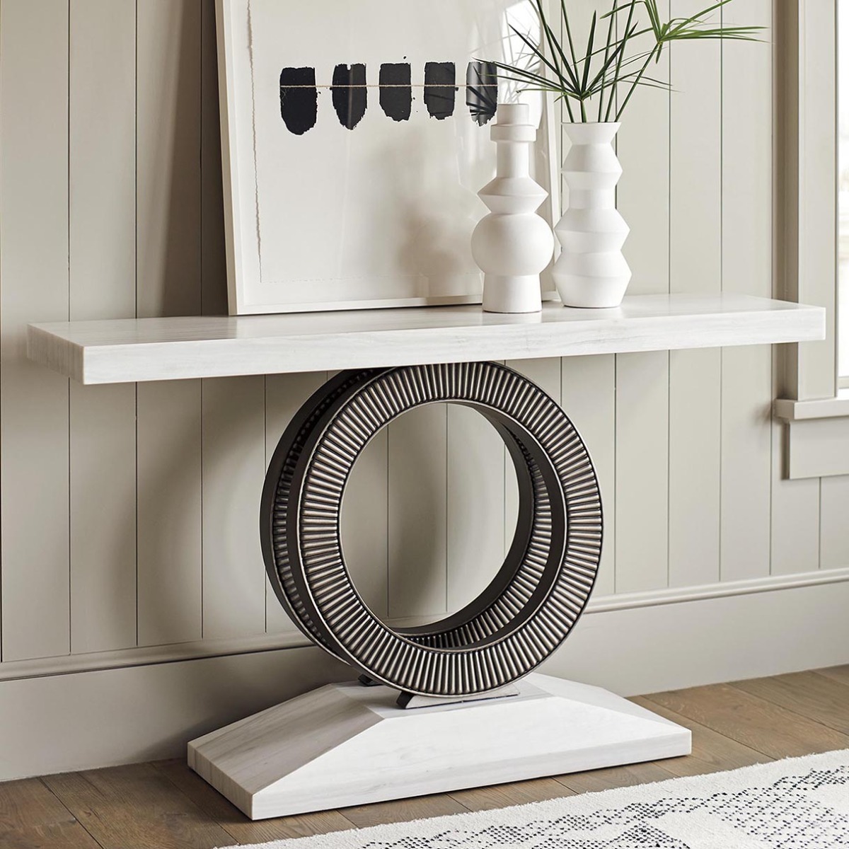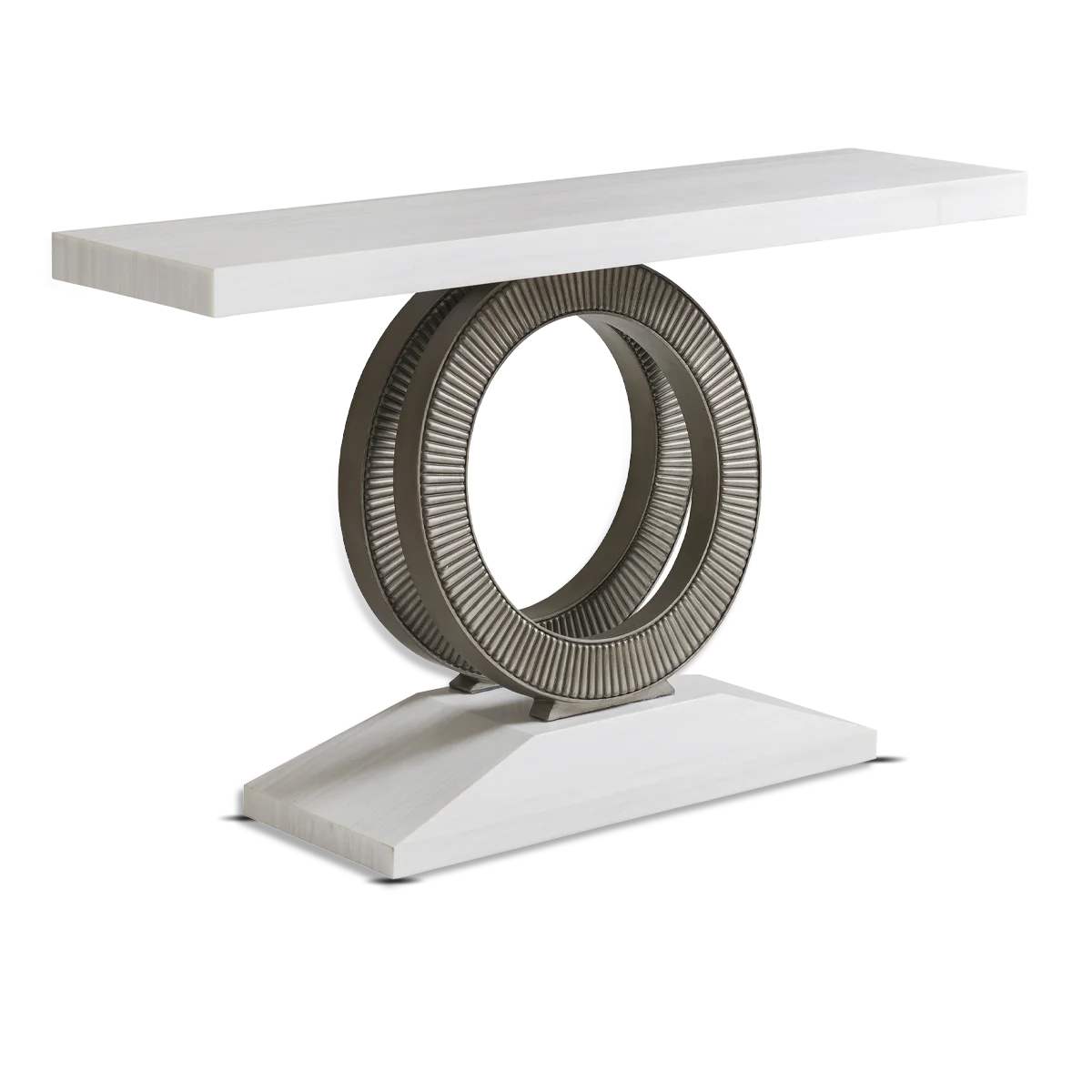 The Wayfarer console has a white veneered Santa Cruz marble top in a leathered finish, supported by decorative circle motifs in a burnished pewter coloration, on a Santa Cruz marble base.
