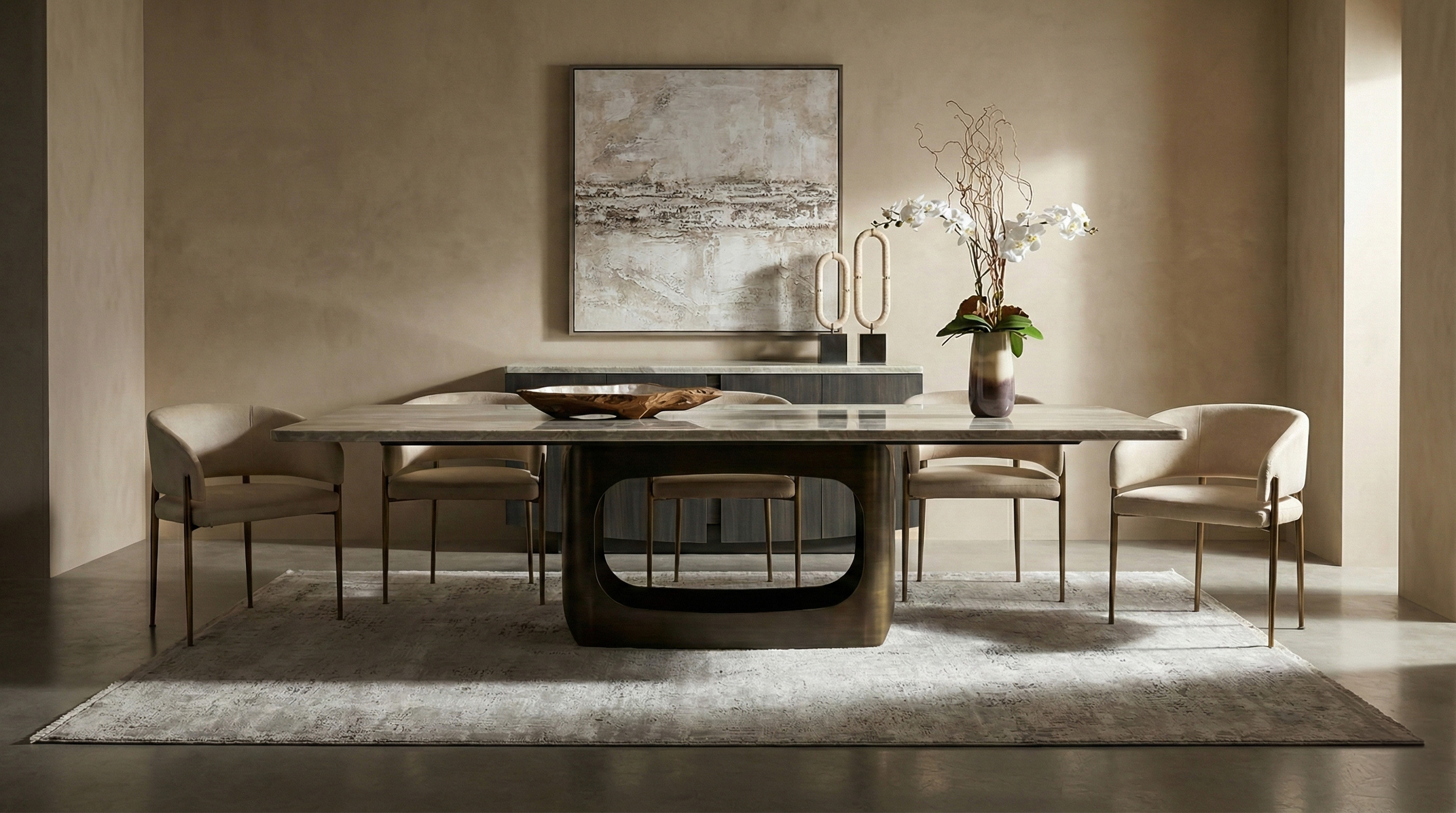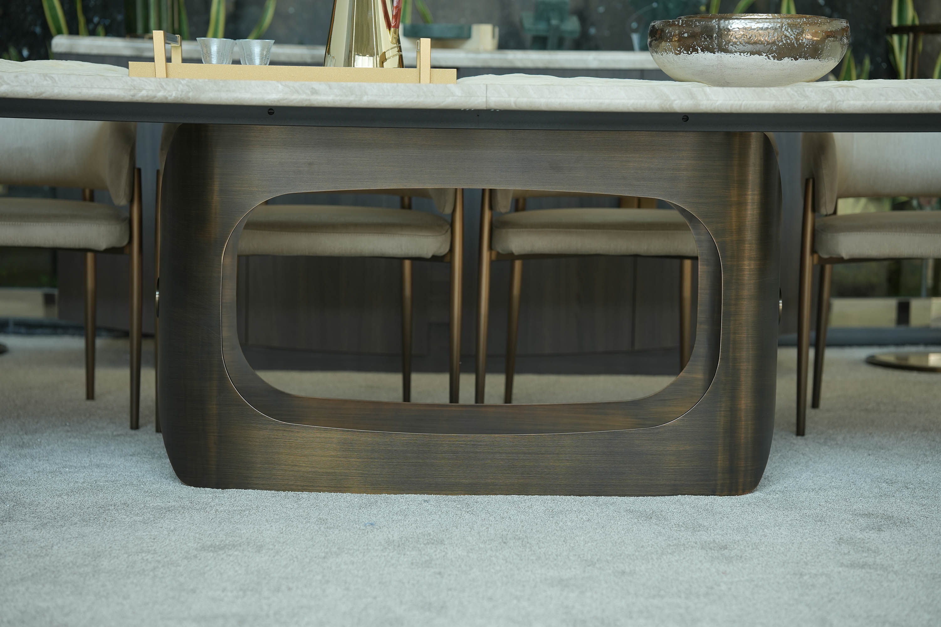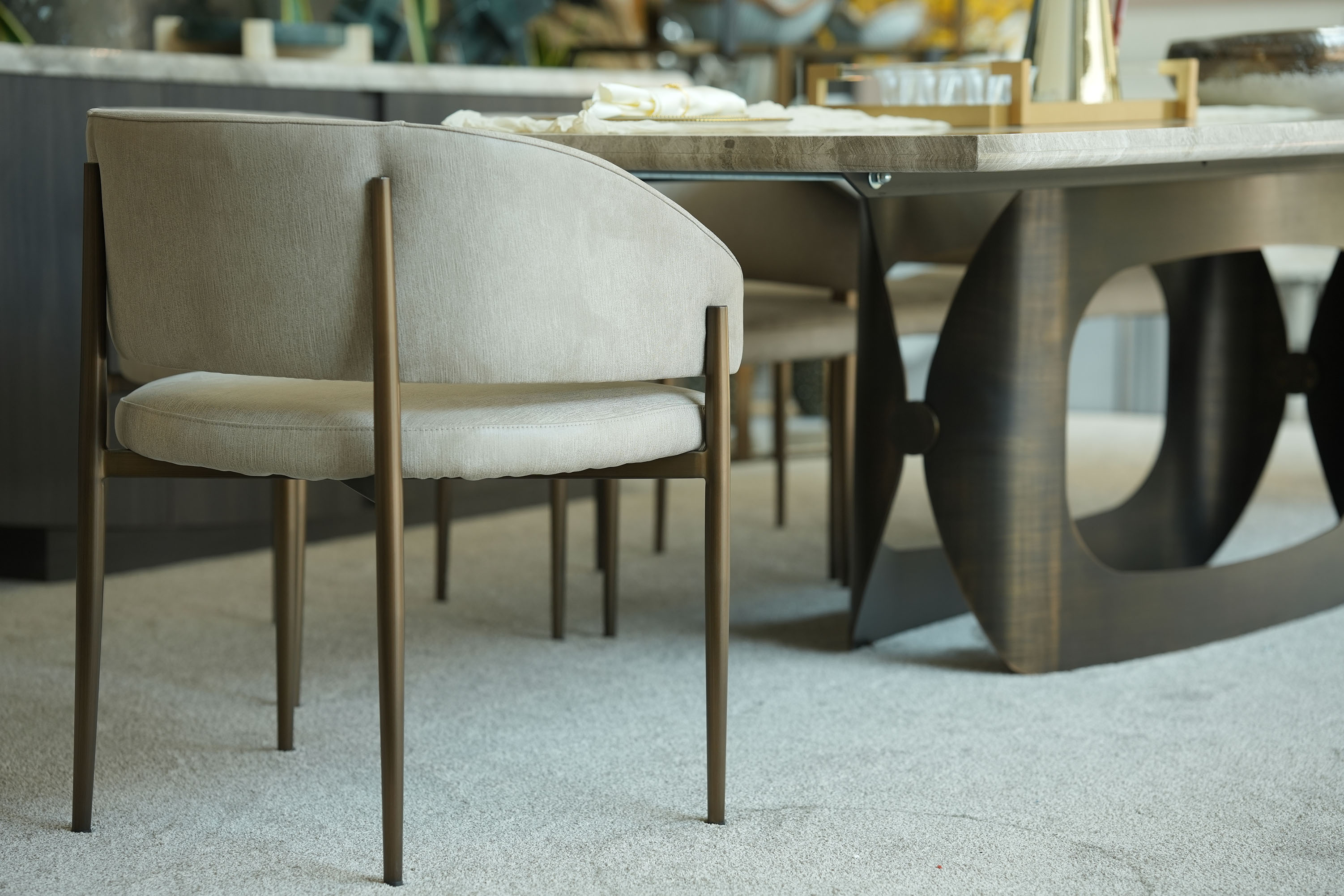The Orion dining table features a sophisticated design with an oxybronze metal base (120 × 40 × 70 cm) and a durable wooden sub-top, combined with a Beige Fantasy (BF) marble-finish top measuring 300 × 120 cm, split into two pieces and supported by one base; it includes a 260 cm ganging mechanism (260 × 5 × 5 cm), making it both elegant and functional for modern dining spaces. Chair is the perfect contemporary chair for your home. The curved backrest design catches the eye at first glance and the seating comfort is exceptional. The vast choice of fabrics and metal finishes of the legs make it the first choice when looking for a chair with a metal base. Sideboard: Inspired by the timeless silhouette of Venice’s iconic gondolas, the GONDOLA Collection glides into the world of luxury interiors with quiet sophistication. Distinguished by the gently arched base design—an homage to the curve of a Venetian boat’s hull—each piece captures a sense of movement, balance, and artisanal grace.