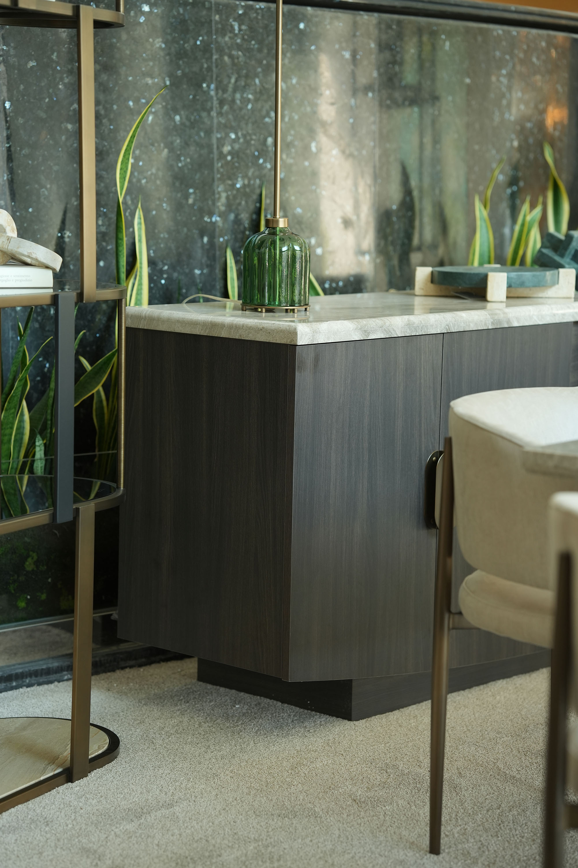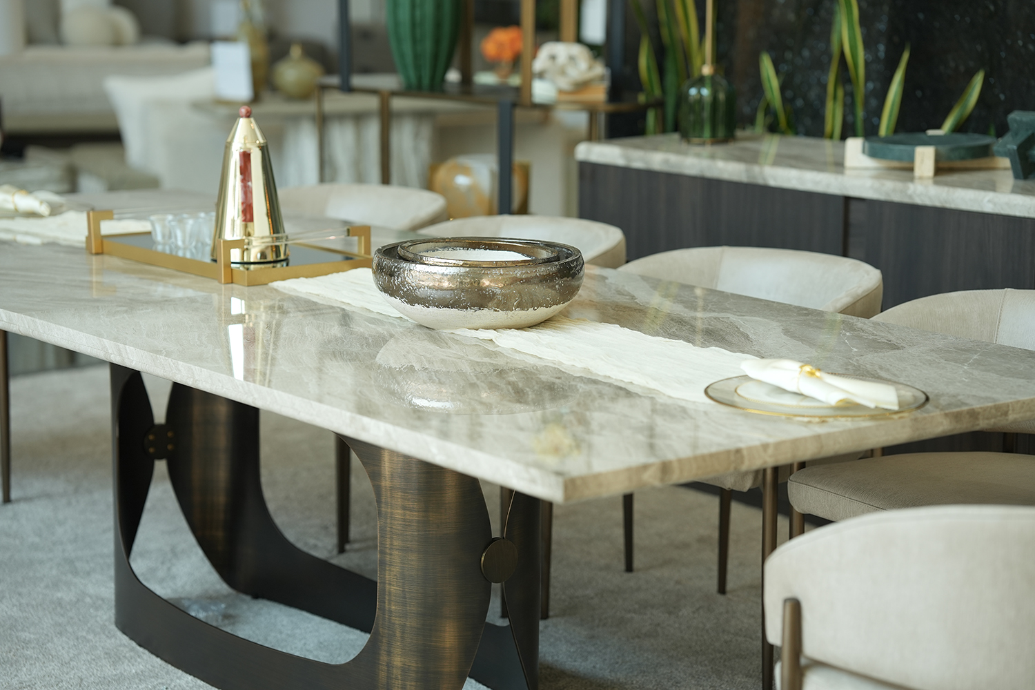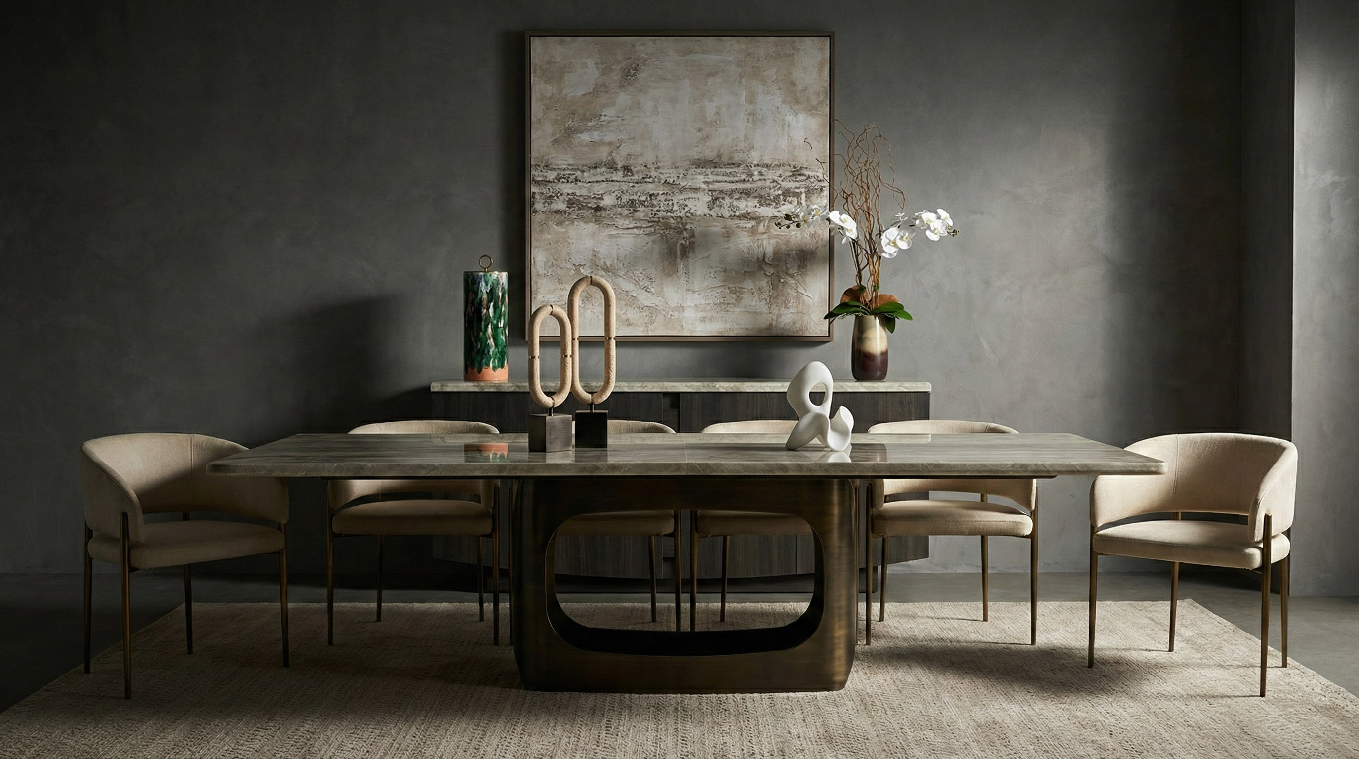 The Orion dining table features a sophisticated design with an oxybronze metal base (120 × 40 × 70 cm) and a durable wooden sub-top, combined with a Beige Fantasy (BF) marble-finish top measuring 300 × 120 cm, split into two pieces and supported by one base; it includes a 260 cm ganging mechanism (260 × 5 × 5 cm), making it both elegant and functional for modern dining spaces. Chair is the perfect contemporary chair for your home. The curved backrest design catches the eye at first glance and the seating comfort is exceptional. The vast choice of fabrics and metal finishes of the legs make it the first choice when looking for a chair with a metal base. Sideboard: Inspired by the timeless silhouette of Venice’s iconic gondolas, the GONDOLA Collection glides into the world of luxury interiors with quiet sophistication. Distinguished by the gently arched base design—an homage to the curve of a Venetian boat’s hull—each piece captures a sense of movement, balance, and artisanal grace.