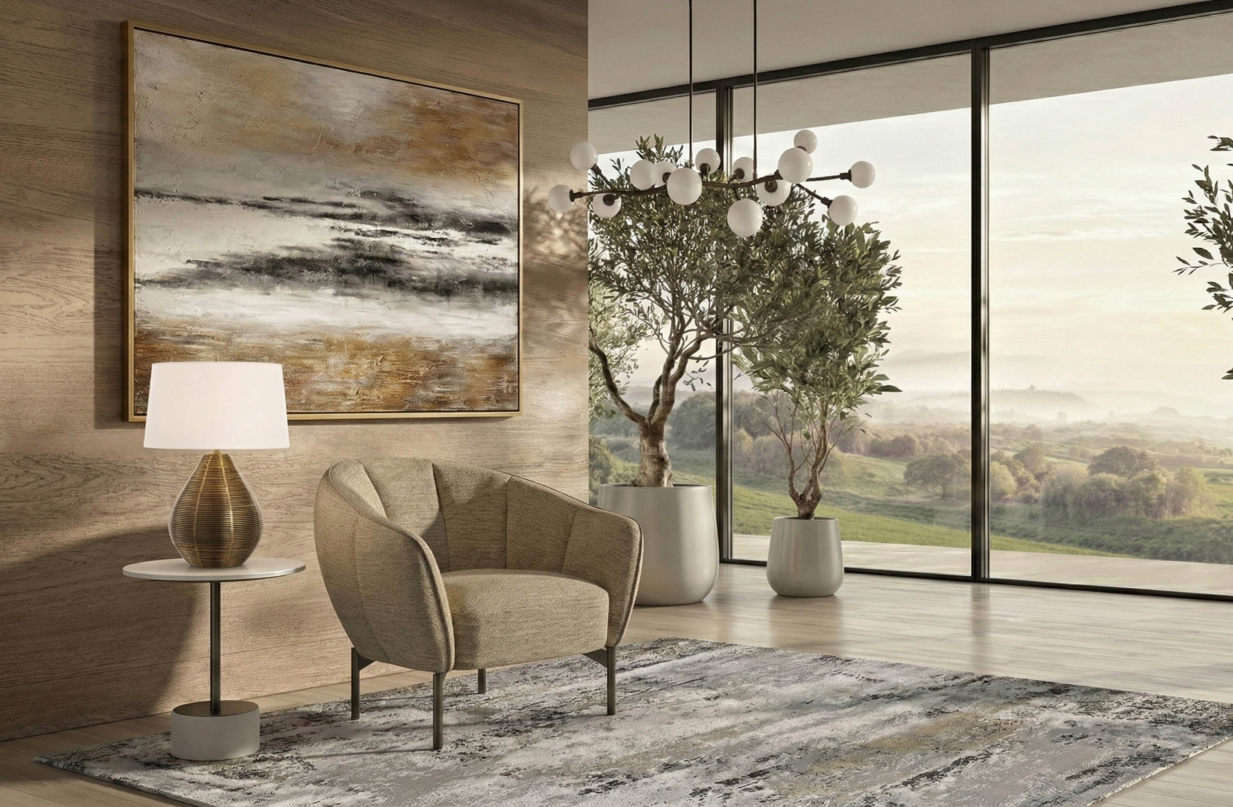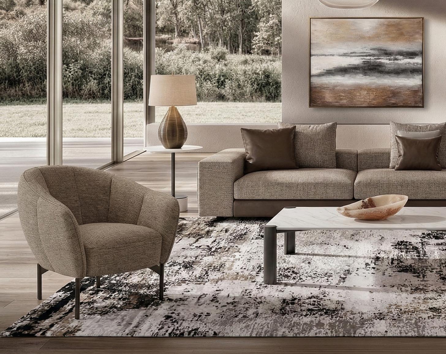Perla Armchair combines refined elegance with exceptional comfort through its soft, inviting silhouette. The rounded backrest, inspired by the gentle curve of a shell, offers a cozy and supportive seating experience. Upholstered in a sophisticated blend of polyester and viscose, it features vertical stitching and piping that elegantly define the chair’s contours, adding a touch of relaxed refinement. Built with a solid wood structure and high-density foam, the Perla Armchair ensures durability and long-lasting comfort, while metal feet in a bronze finish provide stability and complement its graceful, contemporary aesthetic. Its versatile design allows it to harmonize effortlessly with a variety of interior styles, making it a warm and stylish addition to any space.
