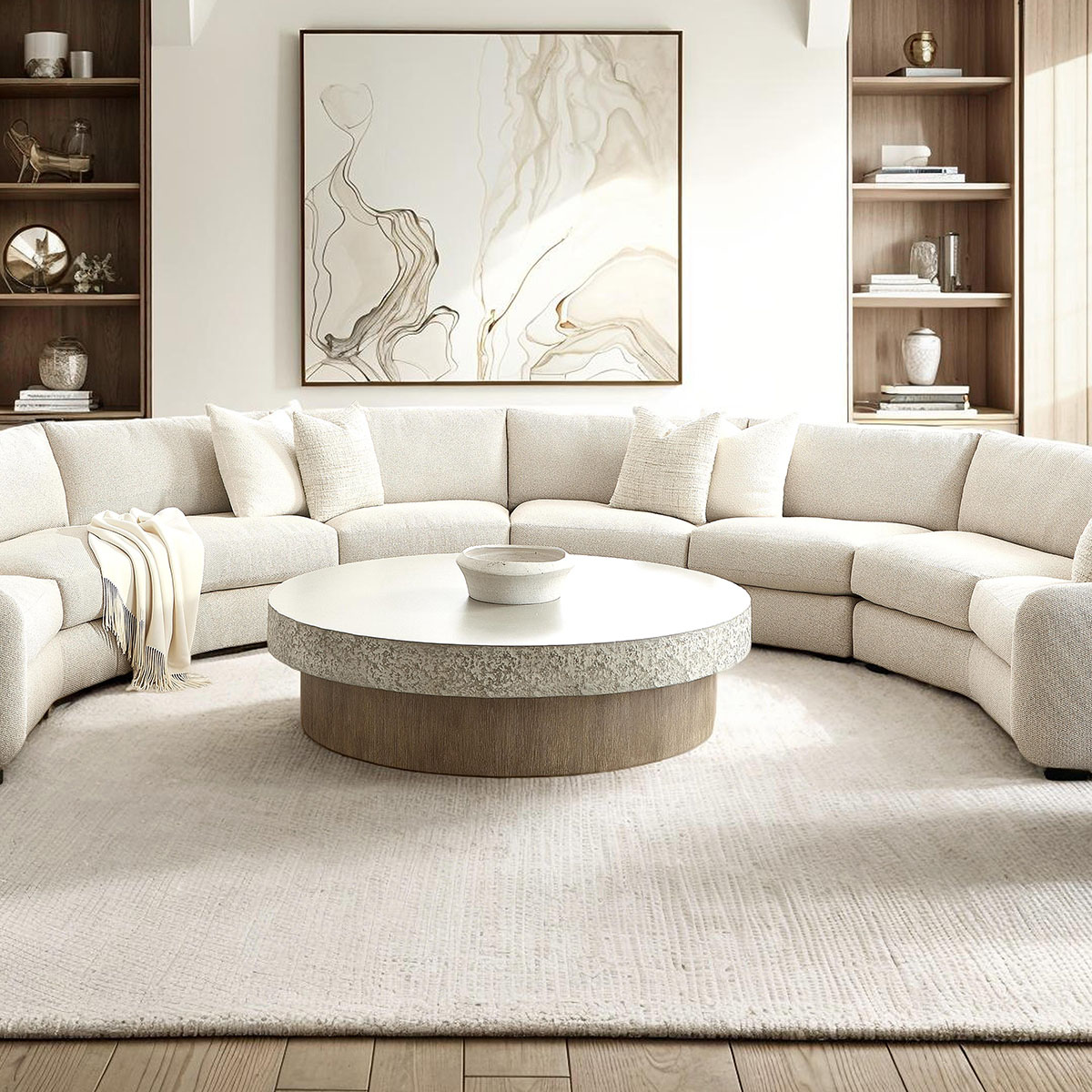 The Pincio cocktail table finds balance in a mix of materials and organic shapes. A smooth cast resin faux stone top with textured edges perches on a round plinth base in wirebrushed oak. The Millstone finish on the top perfectly complements the wood's Trevin finish for a naturally chic design.