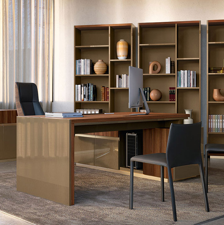 The Porta Romana Desk showcases refined craftsmanship with a walnut veneer enhanced by a brushing bronze high gloss finish. The structure is made from durable chipboard with fine wood veneer, complemented by a coordinating library unit in walnut veneer and melamine panels. This elegant design combines functionality with timeless style, making it a sophisticated addition to any workspace.