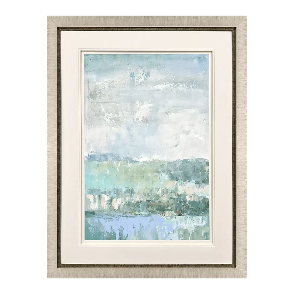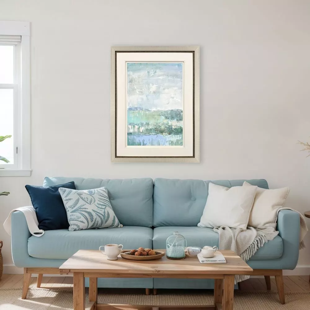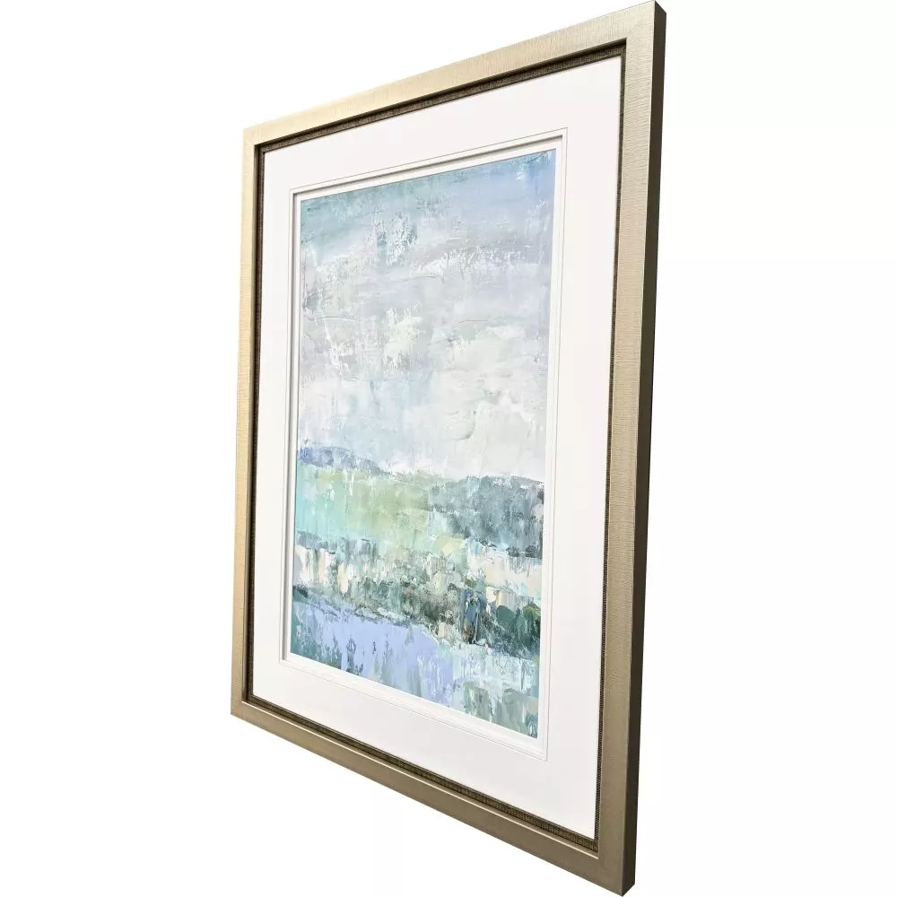 An abstract coastal landscape features raised white matting with a ribbed liner in distressed antique gold. Framed in a champagne gold block moulding.