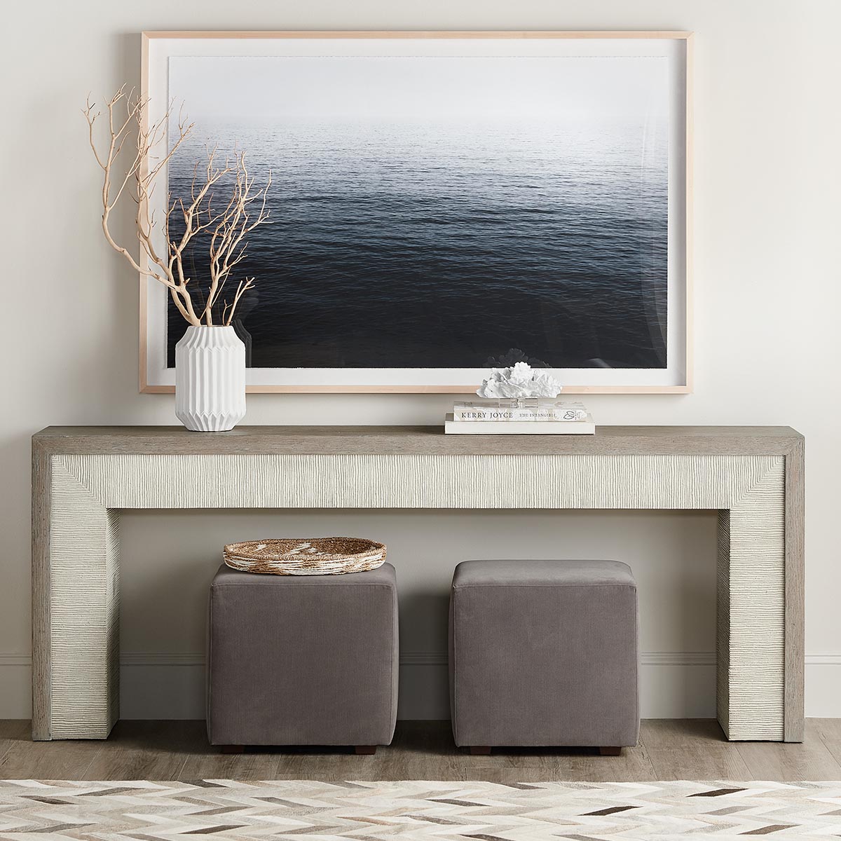 In a crisp two-tone finish combining weathered gray with a textured washed gray color, the Serenity Skipper Console Table brings the organic textures of cottage waterfront living to your space.