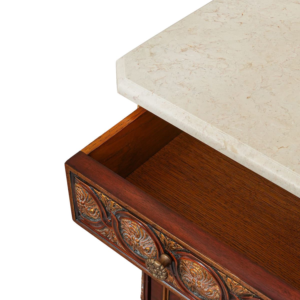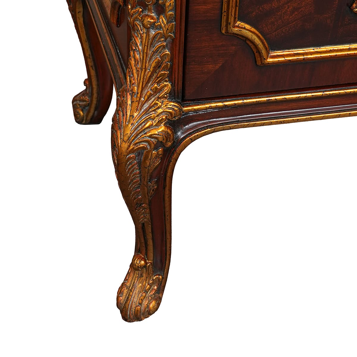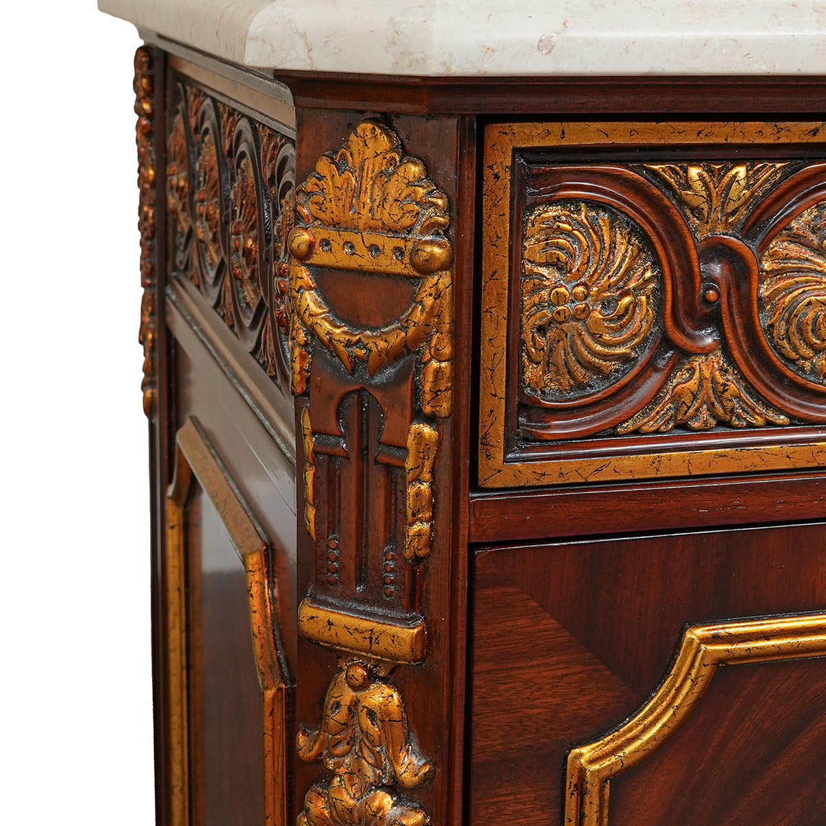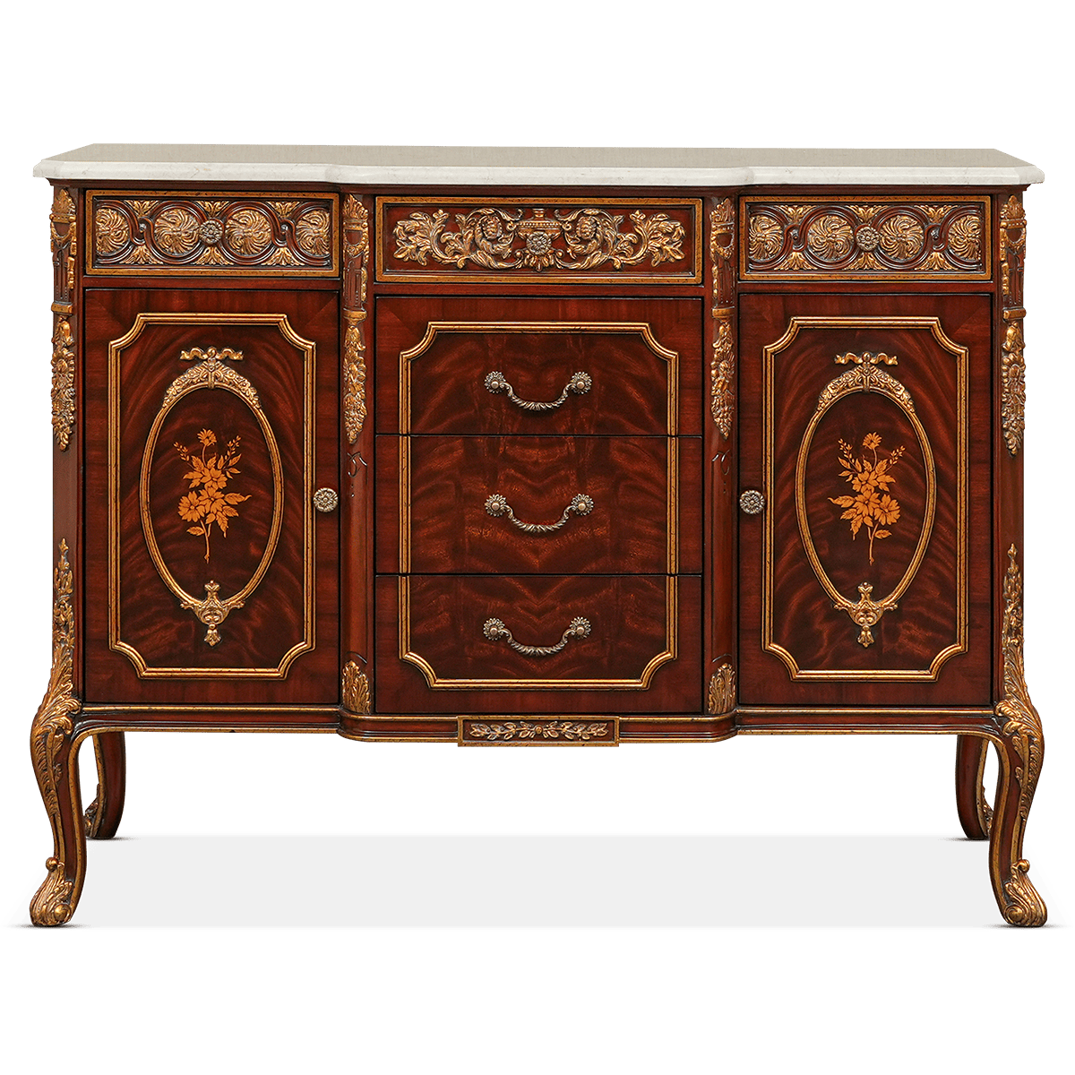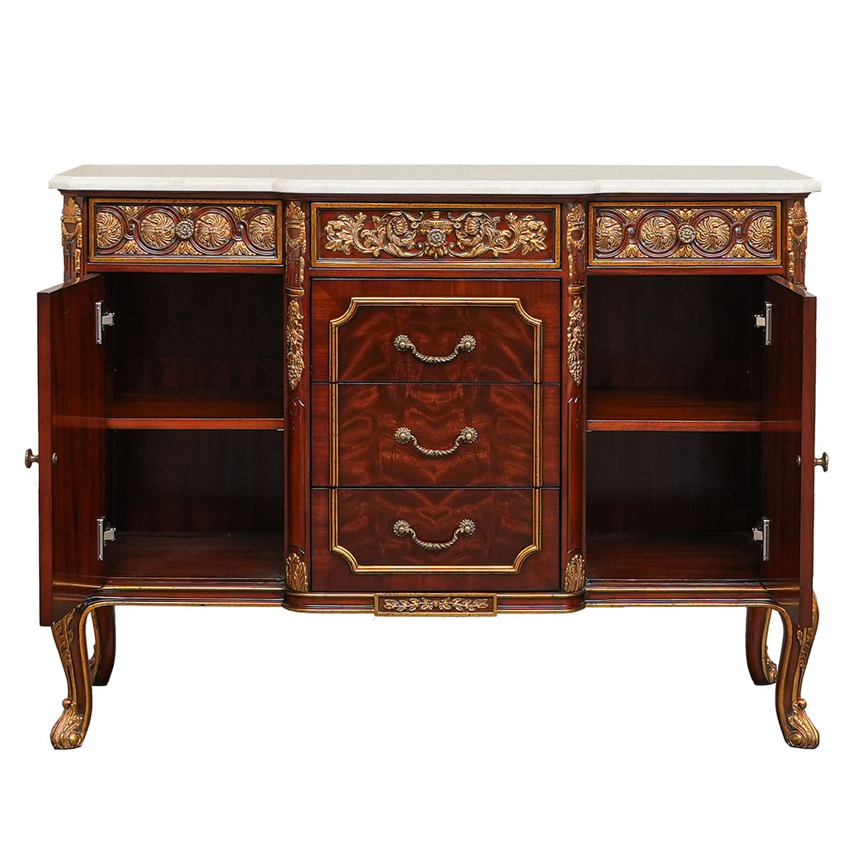 The Server Peninsula, with its luxurious marble top, marquetry veneer, and intricate hand-carving details in a gilded accent, is a true embodiment of classic elegance. It seamlessly combines opulence and functionality, making it a standout addition to your space.