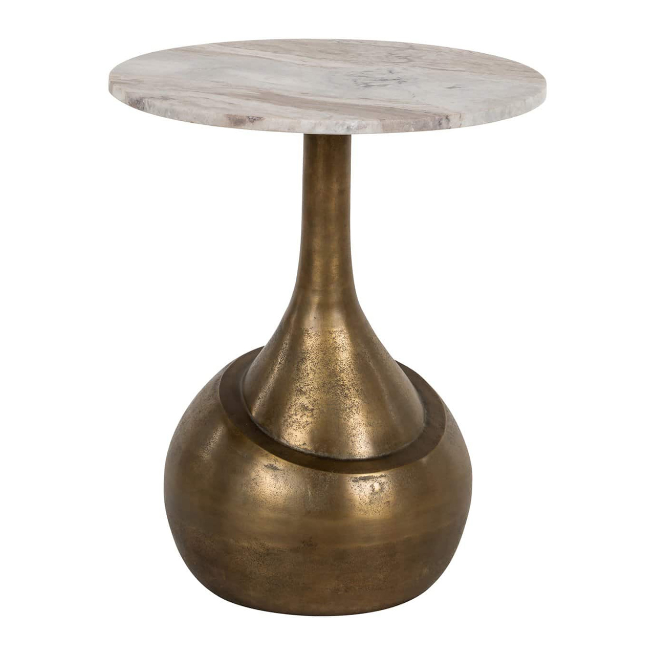 The Sia side table is a luxurious accent table with a natural Toronto marble top and an elegant gold-colored aluminum base. The rich look of the marble combined with the warm metallic frame makes this table a sophisticated addition to any modern or hotel chic interior. Perfect as an eye-catcher next to a sofa, armchair, or in a stylish corner.