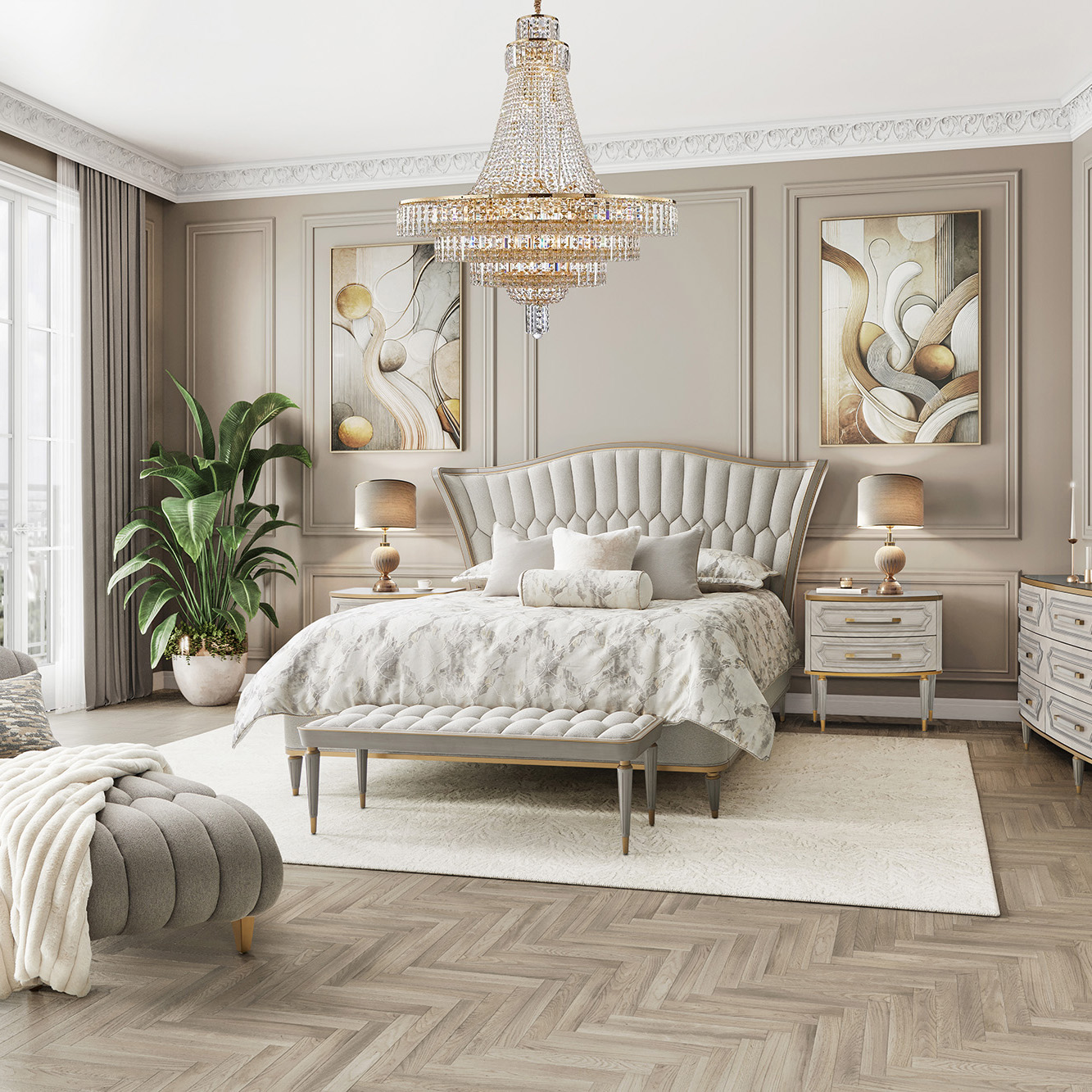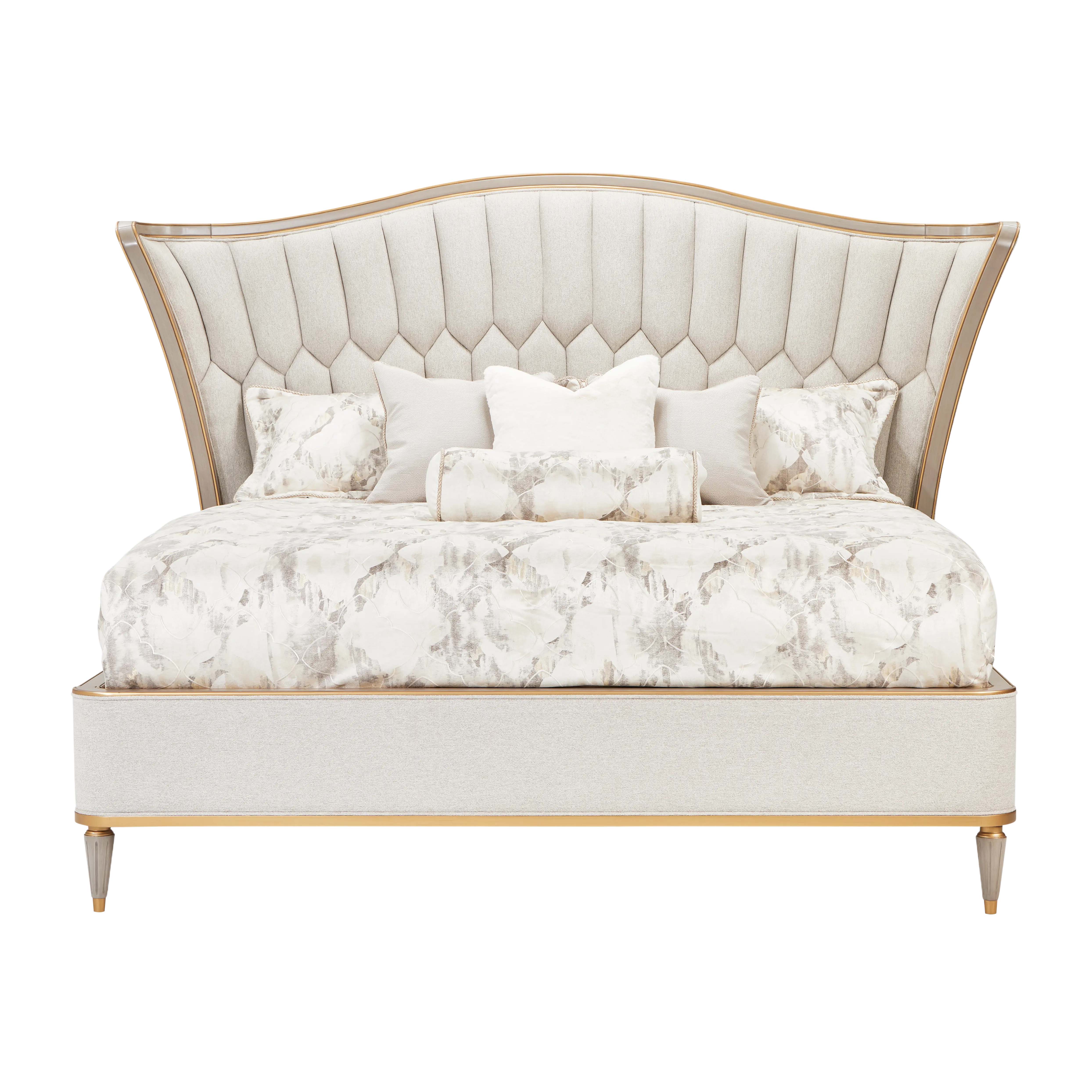 St. Charles King Sized Bedroom – Michael Amini is a luxurious centerpiece designed to create a refined and serene bedroom retreat. The king bed is upholstered in plush chenille fabric with elegant tufting and gracefully sweeping curves, offering both visual softness and exceptional comfort. Thoughtfully integrated dual USB A/C ports in the headboard provide modern convenience, allowing effortless device charging. Accented with sophisticated bronze trim, the design blends timeless elegance with contemporary functionality, making it a distinguished focal point that elevates the ambiance of upscale bedroom interiors.