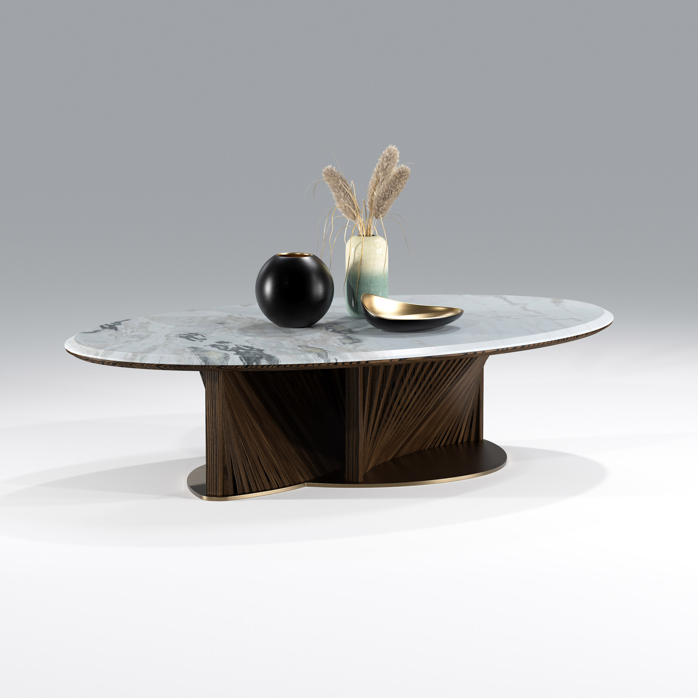 Stardusoval coffee table is a refined statement piece that blends luxurious materials with contemporary craftsmanship. Designed with a polished natural stardust marble top and supported by solid ash wood pedestal legs in a light brown finish, it is complemented by a brushed antique brass metal base with protective coating, offering a harmonious combination of elegance, durability, and modern sophistication.