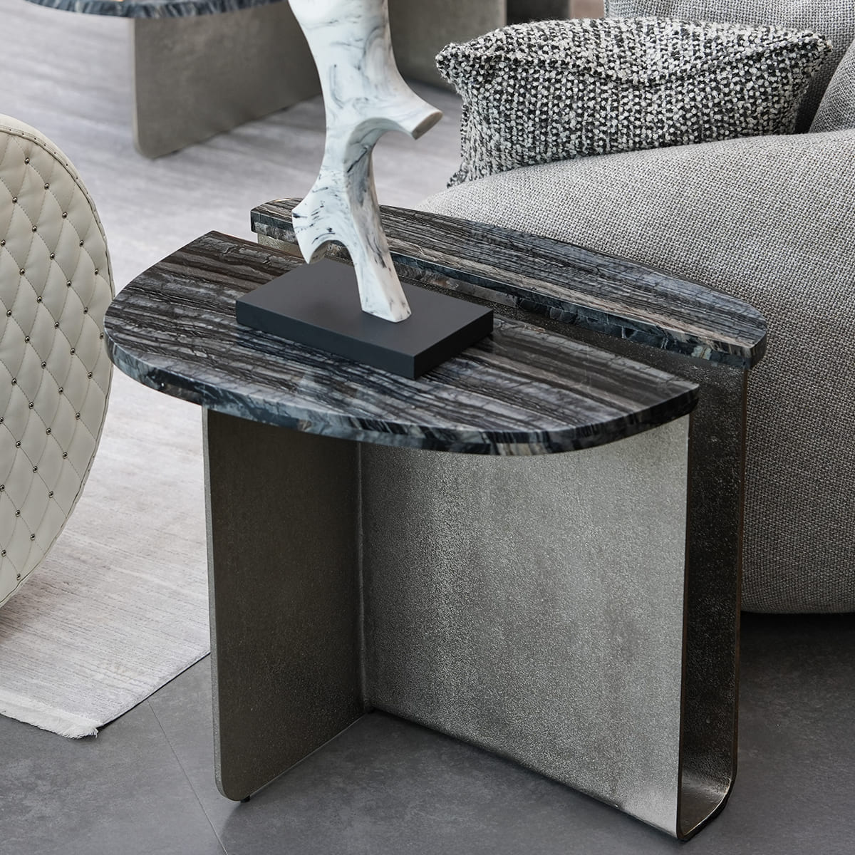 About This Product The Tegan side table is a visual celebration of cutting-edge design. Seen from above, the cast aluminum base appears to be a river that runs through the landscape of Black Forest marble. From the side, the metal flows between the table surfaces, creating an evocative and innovative design.