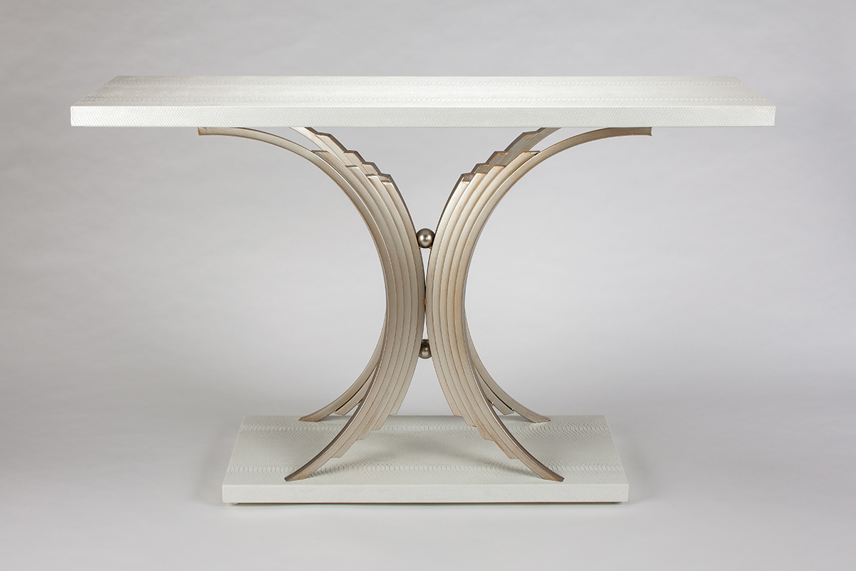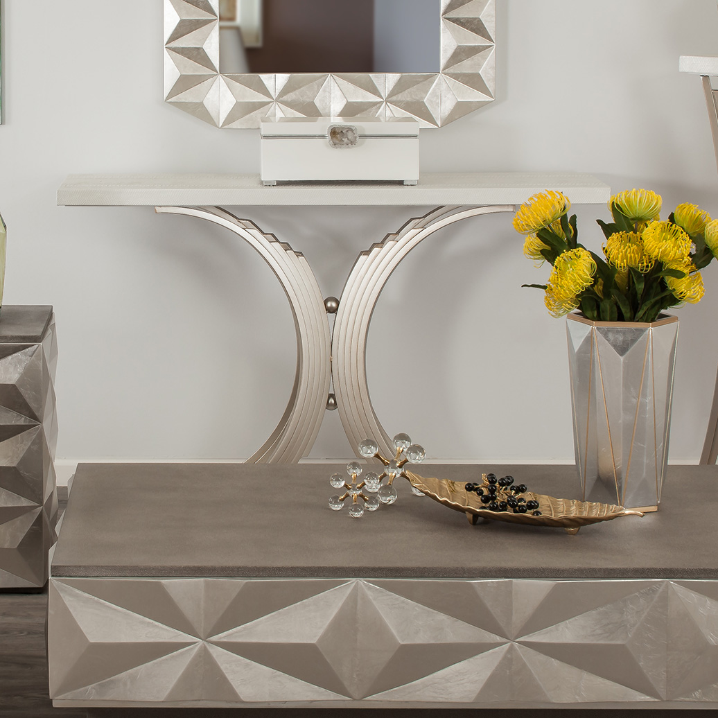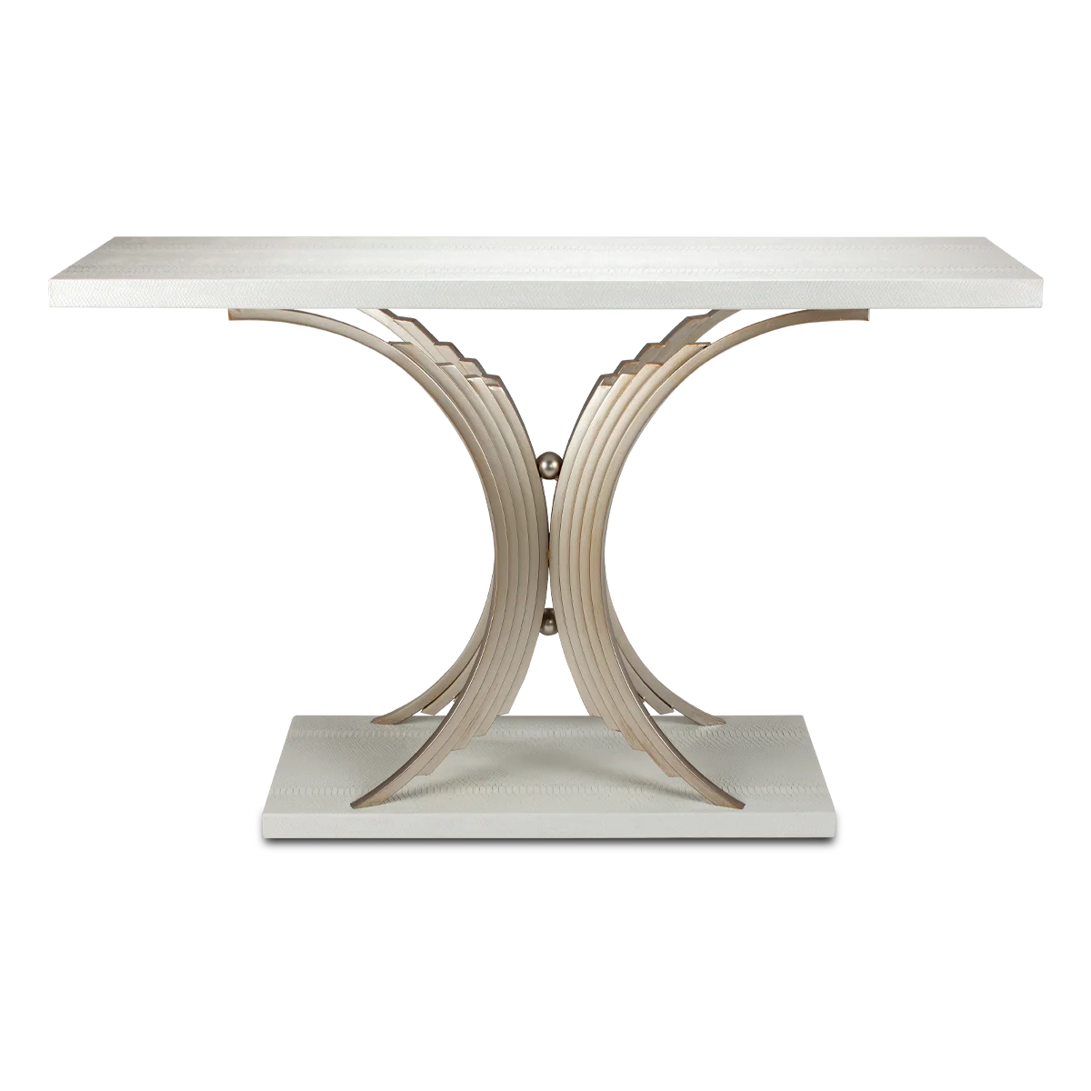 The Arch Console features a refined design combining elegant textures and metallic finishes. The top and base are upholstered in ivory white faux leather, creating a soft and sophisticated surface, while the body showcases metalwork in an old-world silver finish that adds depth and classic character. This balanced combination of materials makes the console a striking decorative piece for entryways or living spaces.