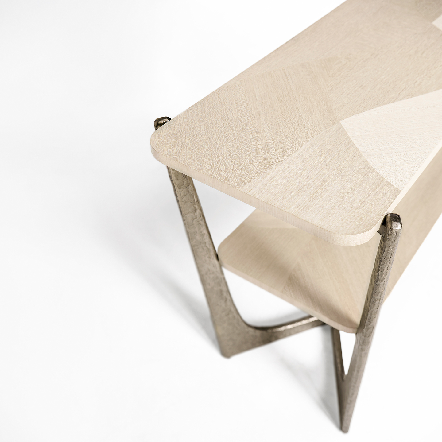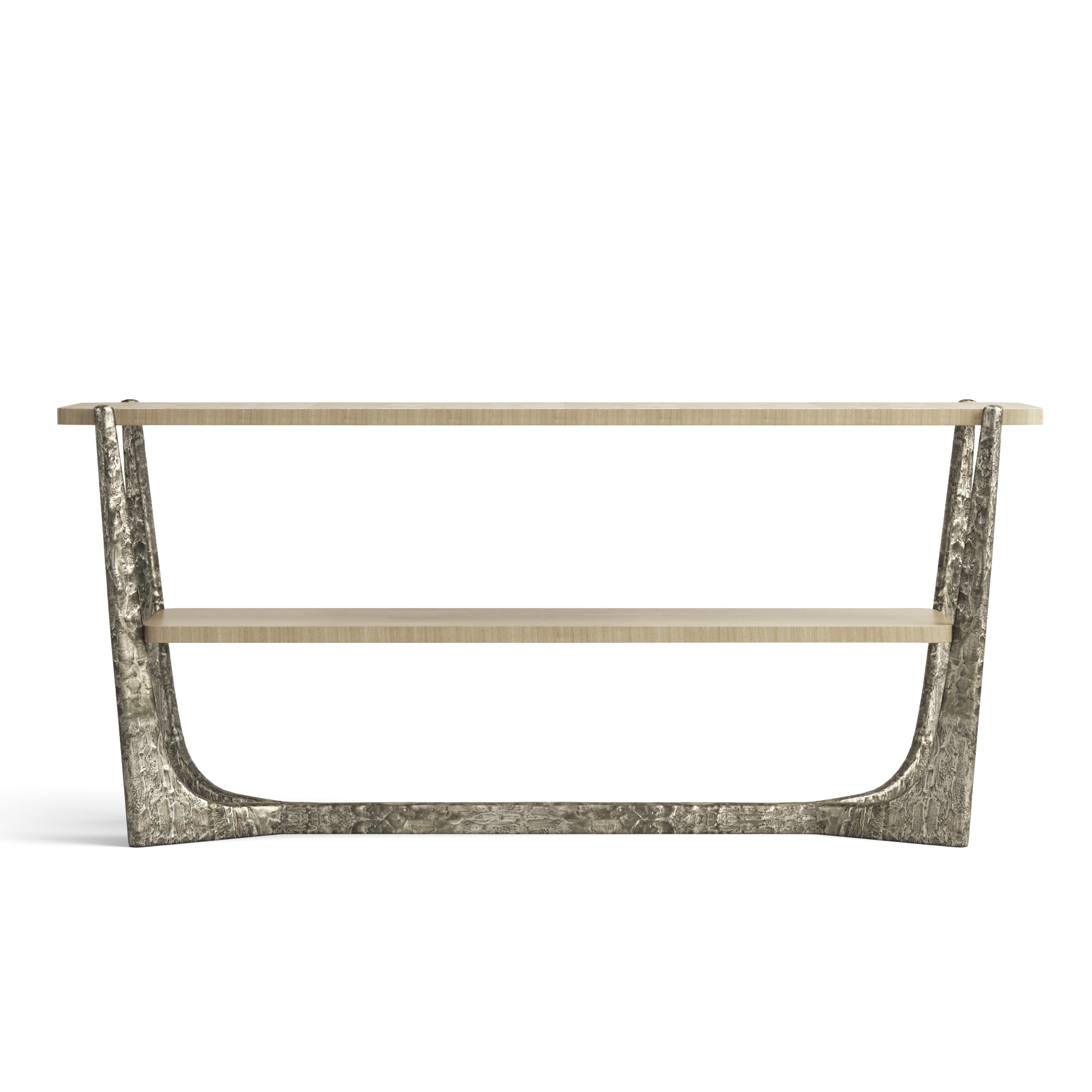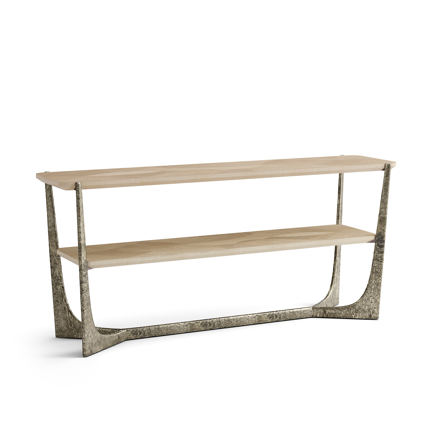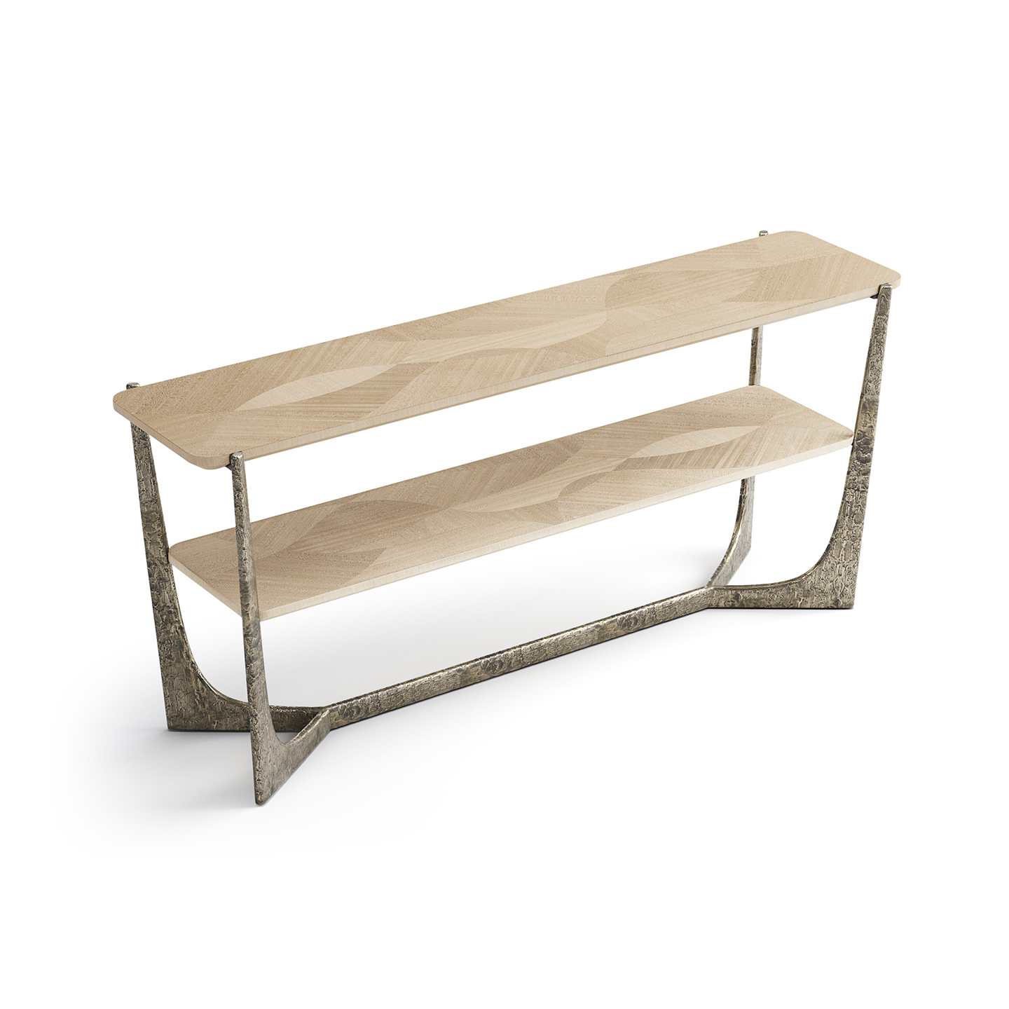 The Tidepool Console Table captures the fluid elegance of modern coastal design with its graceful curves and luxurious materials. A natural dyed Koto veneer top and matching shelf showcase rich wood grain, elevated by a sculptural stainless steel frame that arcs and tapers with architectural poise. Perfectly proportioned for an entryway or behind a sofa, the Tidepool brings airiness and artistry to any interior, balancing function with a quietly bold aesthetic.