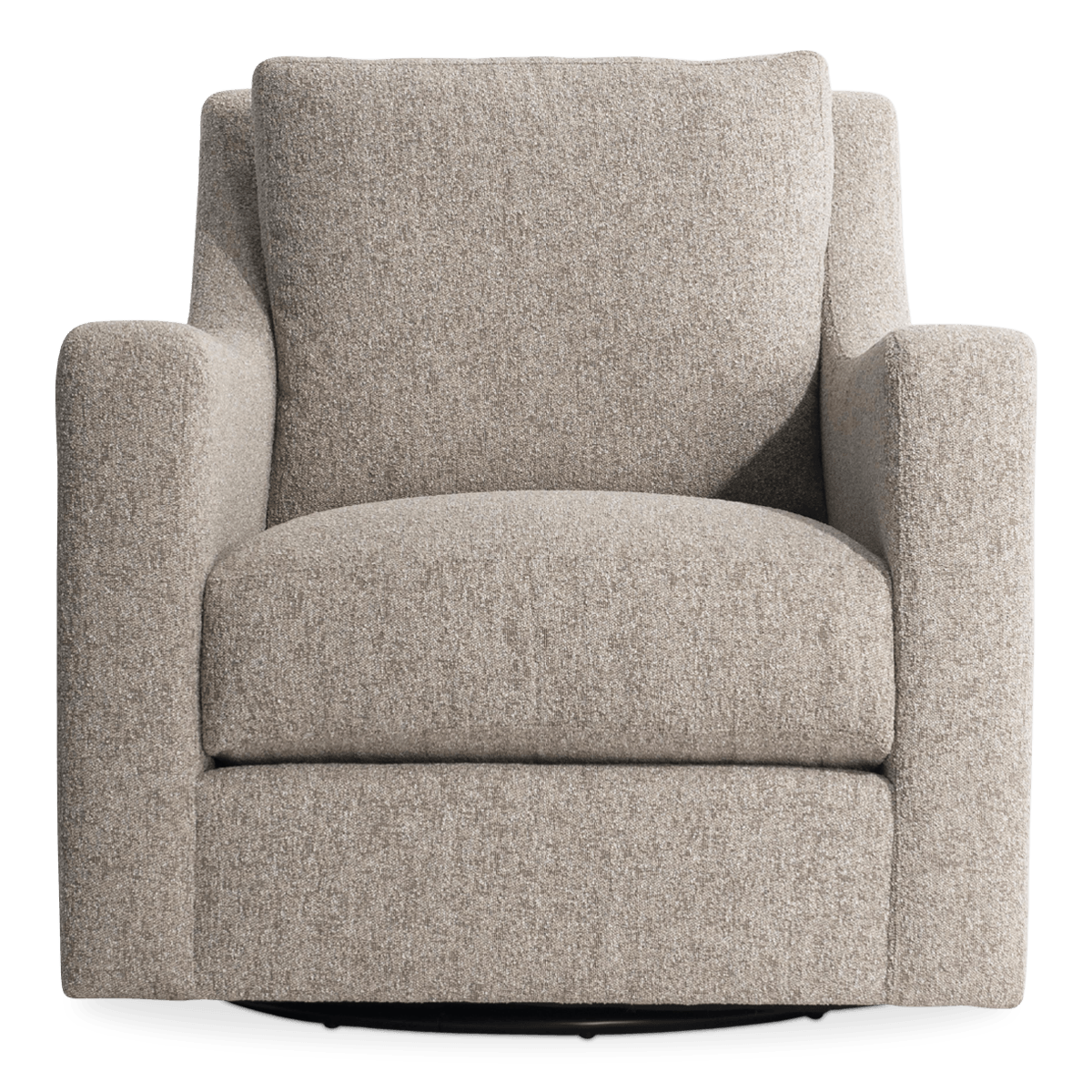 Clean lines and graceful curves blend modern and traditional shaping on the Ventura swivel chair. The arms gently swoop from a tall back and then take a straight line to the smooth swivel base. A deep seat cushion and box-edge bordered back pillow provide the ultimate in comfort.