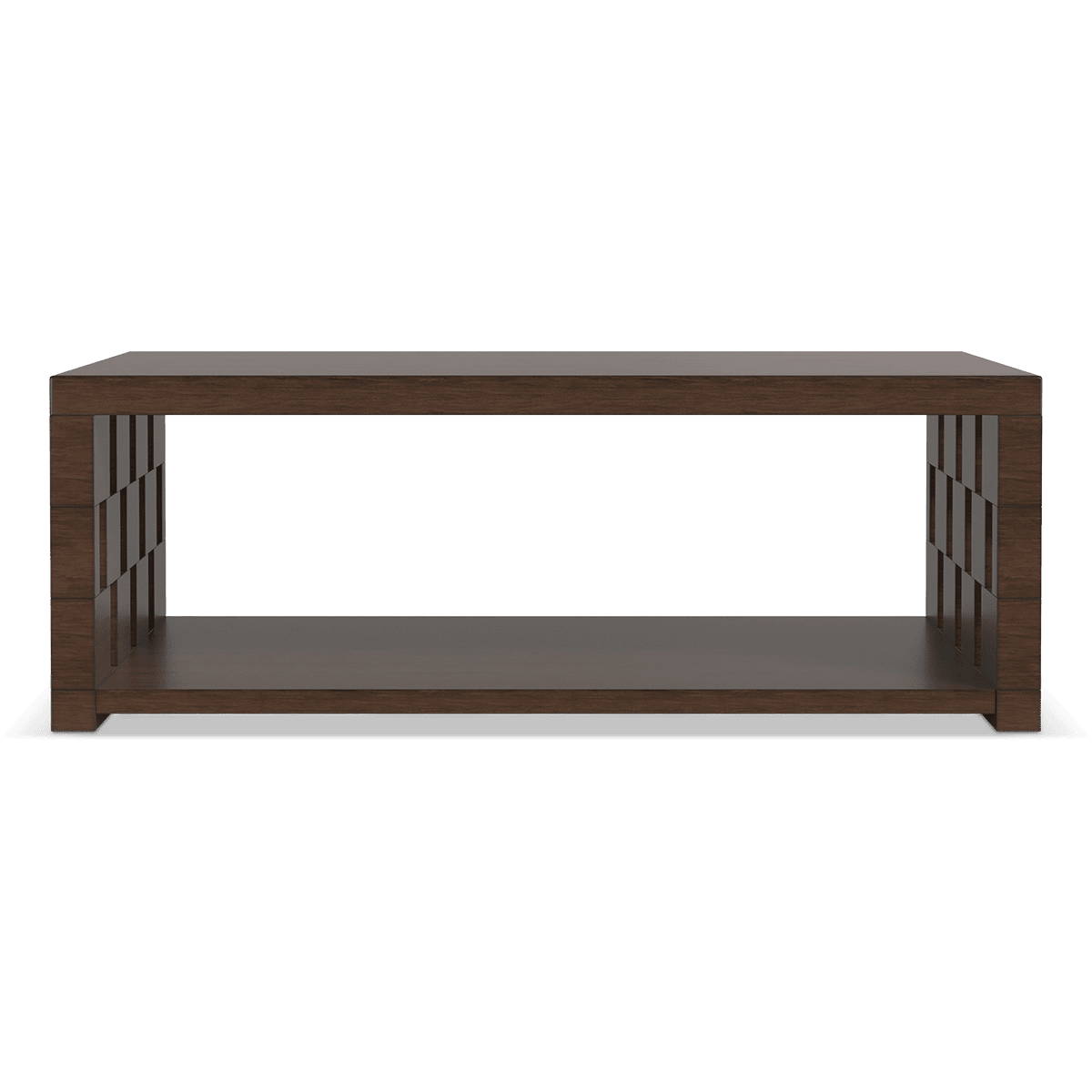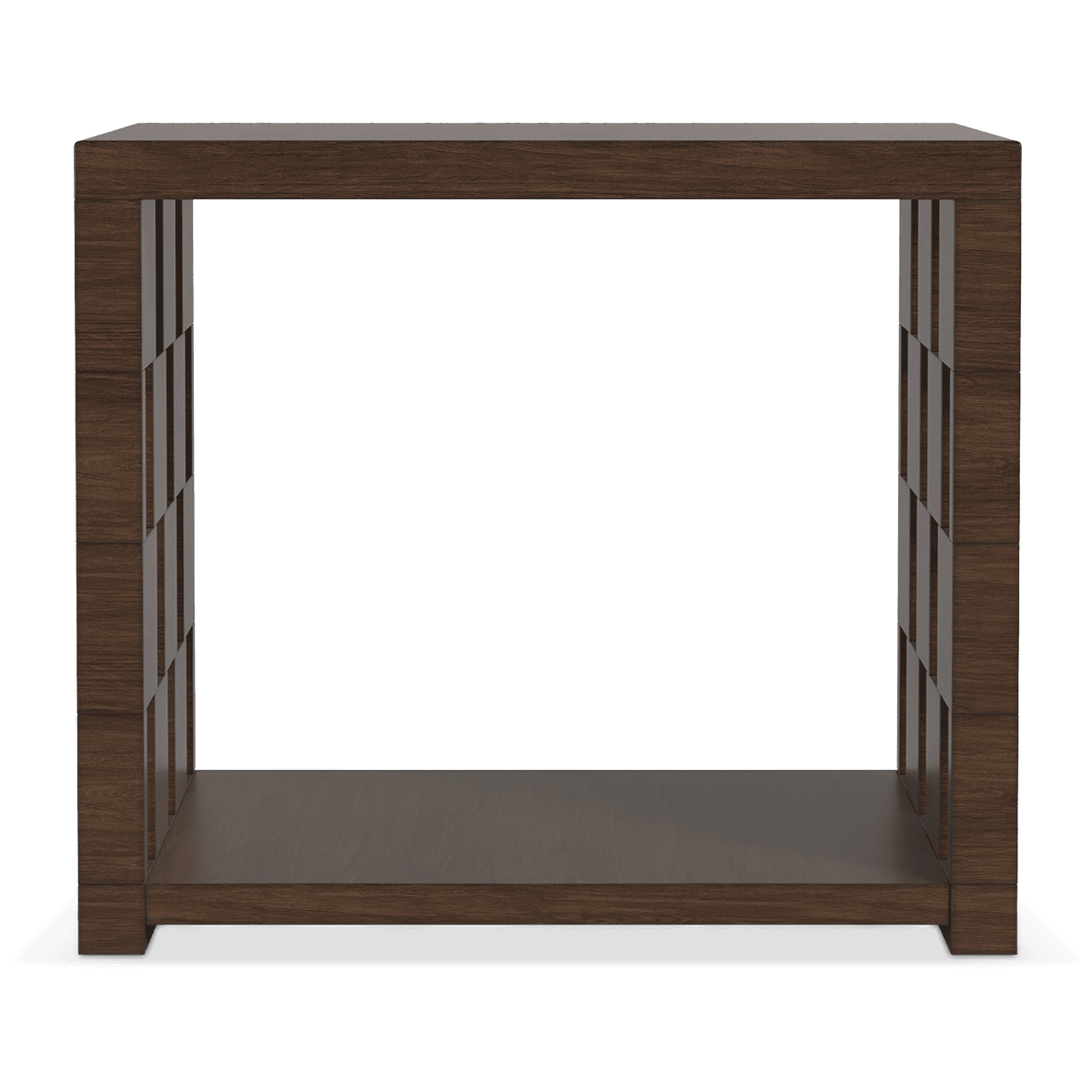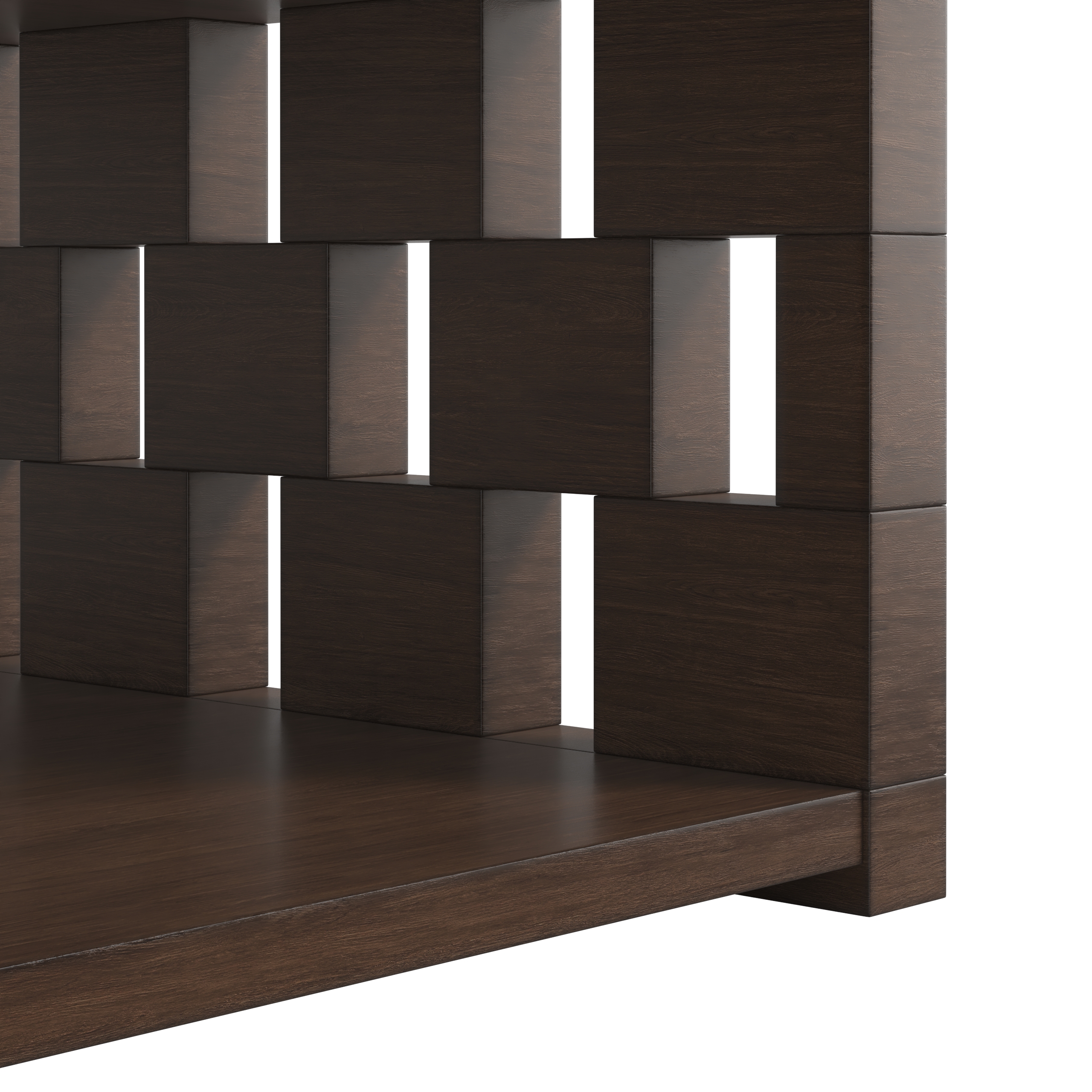 Verge table set by A.R.T. Furniture showcases a unique handcrafted walnut finish that is beautifully balanced by the clean lines of its rectangular tabletop. Open geometric side panels introduce captivating visual texture and a touch of modern artistry, while the lower shelf offers practical space for storage or display. With its substantial form and bold yet refined presence, Verge table set delivers both functionality and sophisticated style, creating a striking focal point with understated drama.