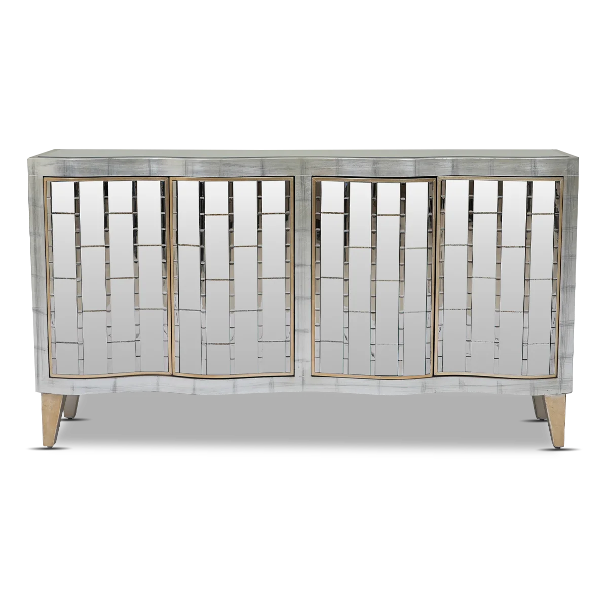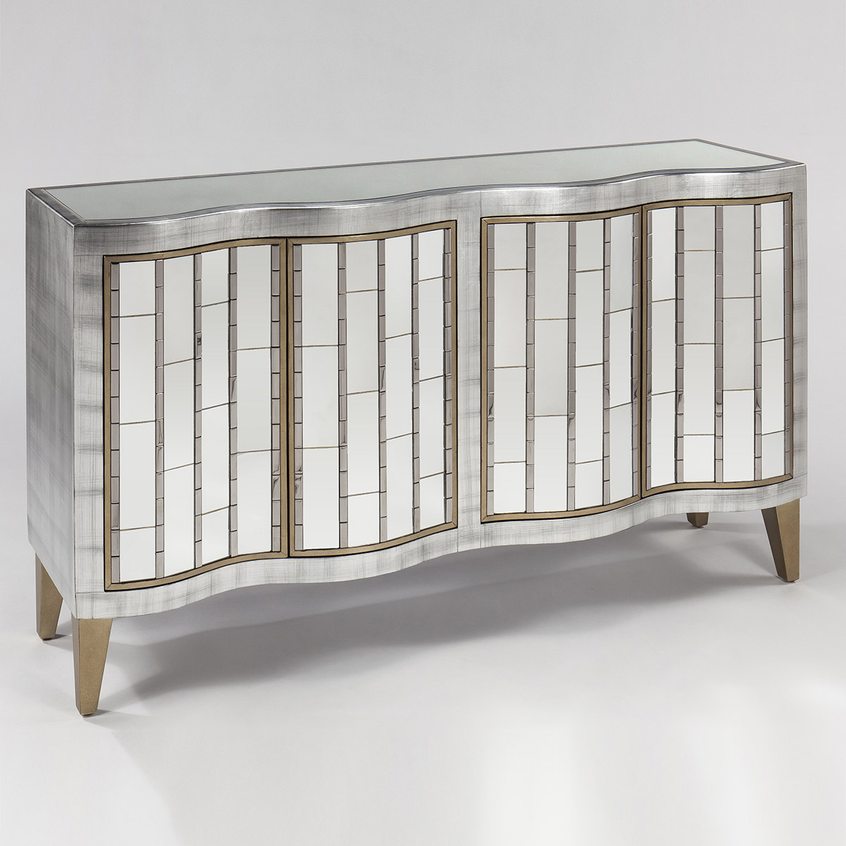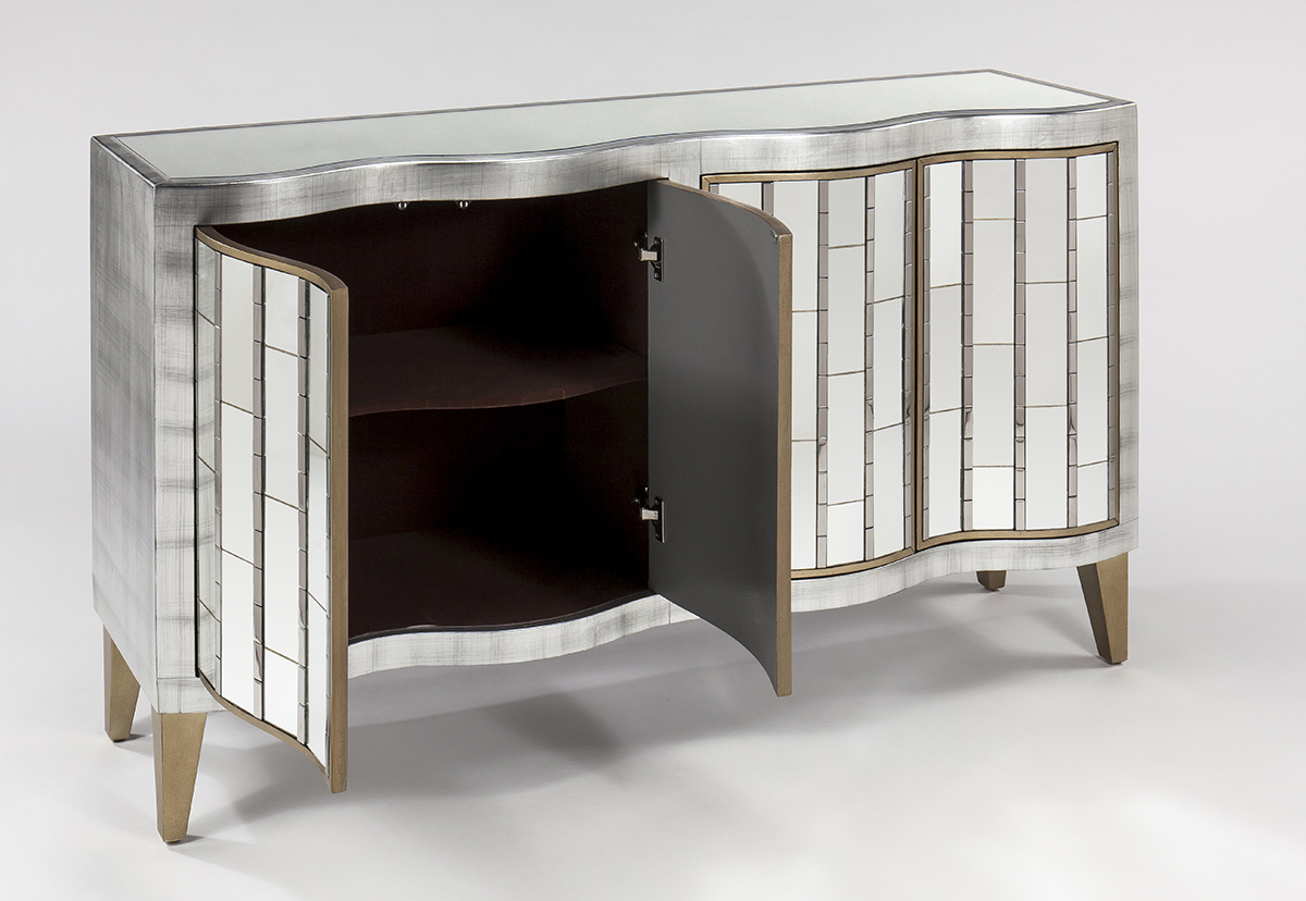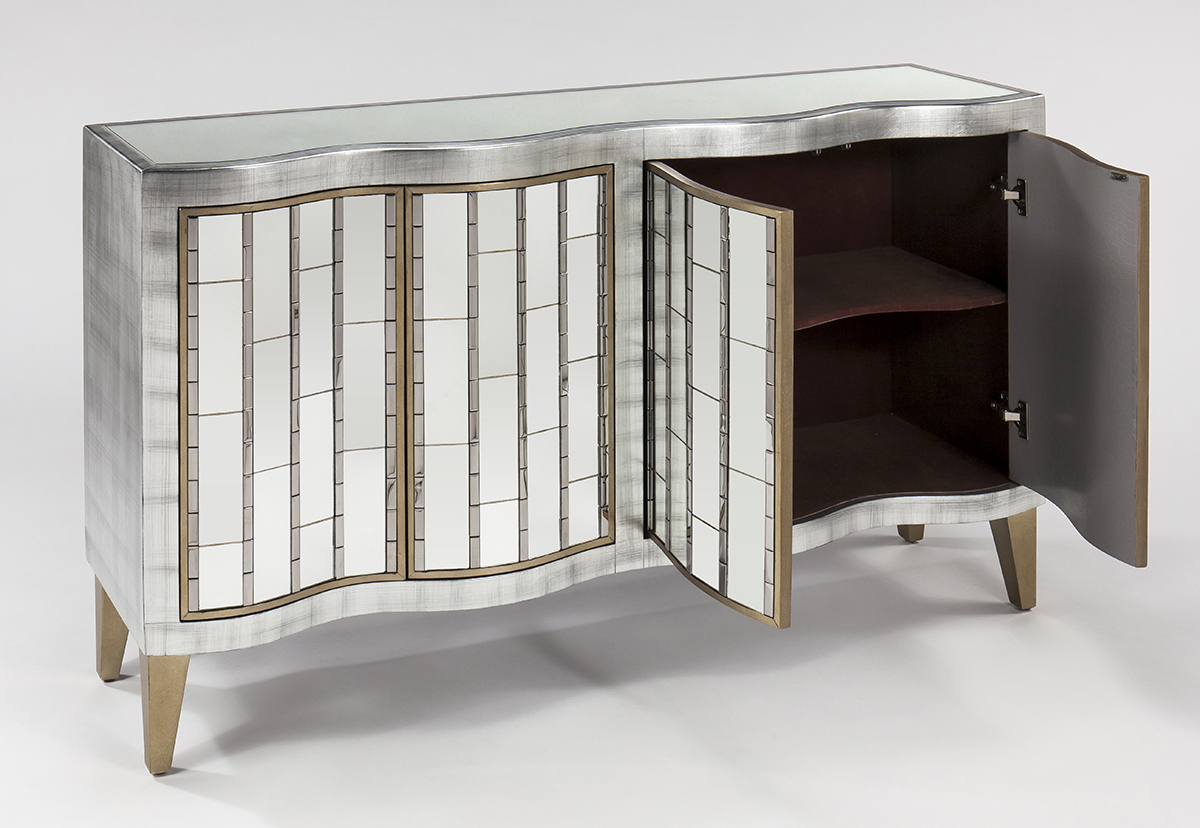 Waves cabinet. Mirror top and front. Silverleaf with coppery gold, accented with brass detail. Handpainted. Wavy scallop front, mirror front and top. 4 Doors, 1 shelf. Touch Latch Open. Doors with brass details.