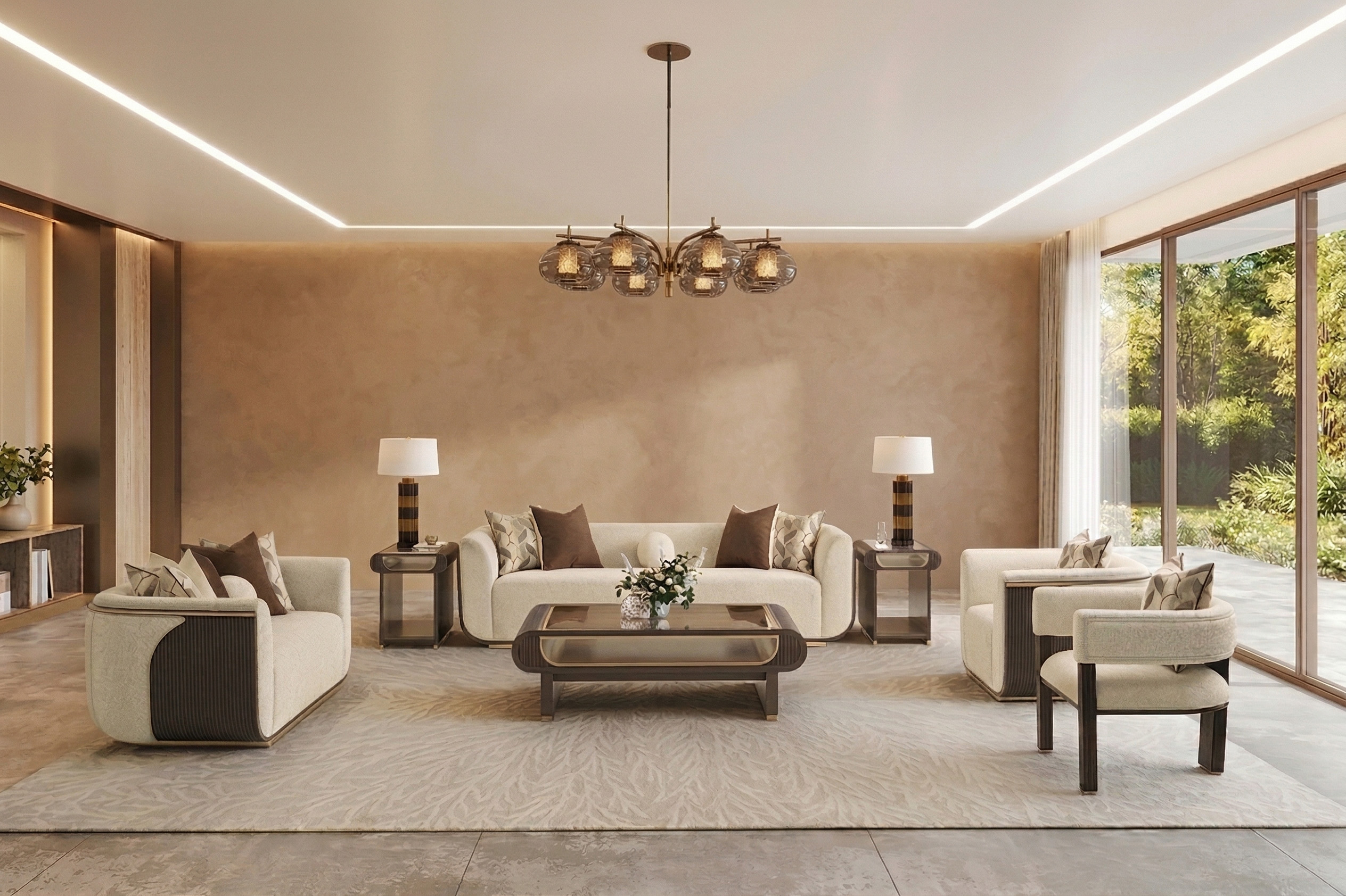 Compact yet striking, the West Kensington Loveseat delivers refined elegance with a bold architectural presence. Wrapped in plush, chunky woven fabric with multi-hued yarn, its soft texture invites relaxation, while deep espresso-finished reeded panels create a striking contrast. A sleek gold base and delicate trim trace the loveseat’s graceful curves, adding a subtle touch of glamour. Thoughtfully curated accent pillows complete the look, blending plush textures and rich tones for an effortlessly stylish finish. Textural Upholstery: Woven chunky fabric with multi-hued yarns in a natural hue for a sophisticated, dimensional look. Signature Reeded Wood Details: Espresso-finished side panels with a reeded texture, adding depth and craftsmanship. Refined Gold Accents: Subtle gold trim enhances the silhouette with a touch of luxe contrast. Coordinated Accent Pillows: Two chenille jacquard pillows are complemented by a round faux-sherpa pillow, offering a plush, layered aesthetic. Graceful Curved Design: A sculptural form that balances contemporary style with timeless elegance.