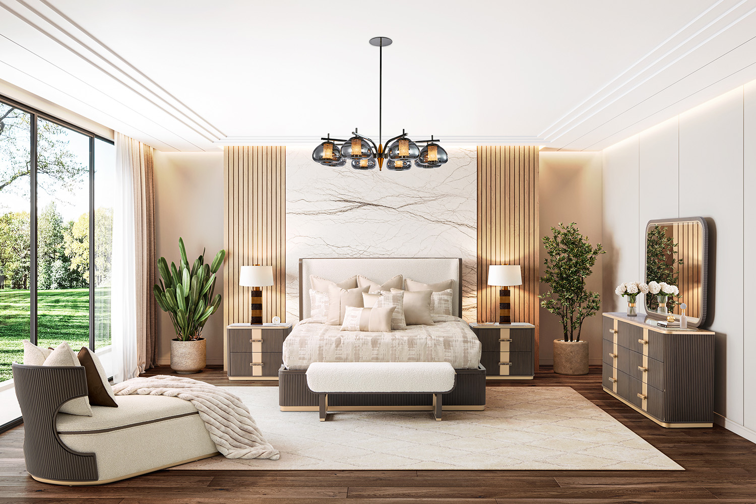 Sleek, sculptural, and indulgently comfortable, the West Kensington Chaise is a refined statement of modern luxury. Wrapped in a plush chunky woven fabric with multi-hued yarn, its soft texture invites pure relaxation. The distinctive back panel, adorned with espresso-finished reeding, creates a striking visual contrast, while an elegant gold base and espresso trim along the sides enhance its architectural form. Two feather-filled pillows—one in matching upholstery and the other in a rich faux-suede that reverses to faux-sherpa—complete the look with a touch of sophisticated comfort. Sculptural Statement Design: A bold, modern silhouette with a refined, architectural presence. Plush Textured Upholstery: Woven chunky fabric with multi-hued yarns in a soft natural tone for a refined, inviting feel. Striking Reeded Wood Back: Espresso-finished reeded wood detailing provides a bold architectural contrast. Gilded Accents: A gold base and espresso trim highlight the chaise’s graceful contours. Indulgent Comfort: Includes two feather-filled accent pillows, one in faux-suede that reverses to faux-sherpa.