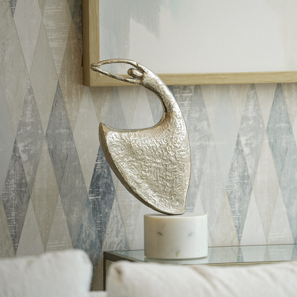 The Windswept Waltz Sculpture on Marble is a breezy accent piece that introduces a subtle sense of motion to a space. A metallic figure in a nickel finish is displayed as they battle a strong gust of wind, being whisked away to the side. The figure sits atop a gorgeous, rounded base of white marble